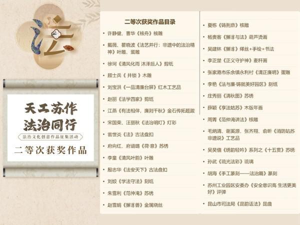 為深入實(shí)施蘇州市“八五”普法規(guī)劃,推動(dòng)法治文化與非物質(zhì)文化遺產(chǎn)深度融合發(fā)展,今年,江蘇省蘇州市委宣傳部、蘇州市司法局、蘇州市文化廣電和旅游局、蘇州市文學(xué)藝術(shù)界聯(lián)合會(huì)以“天工蘇作 法治同行”為主題在全市開(kāi)展了法治文化創(chuàng)意作品征集活動(dòng),積極探索創(chuàng)新法治宣傳形式,讓法治精神和法治信仰深入人心。