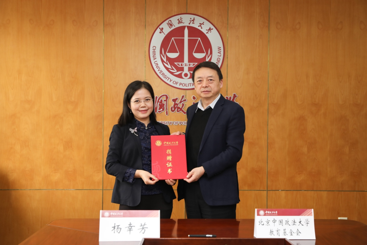 盧春龍代表中國政法大學和楊幸芳簽署捐贈協(xié)議,馬懷德代表中國政法大學向楊幸芳頒發(fā)捐贈證書。