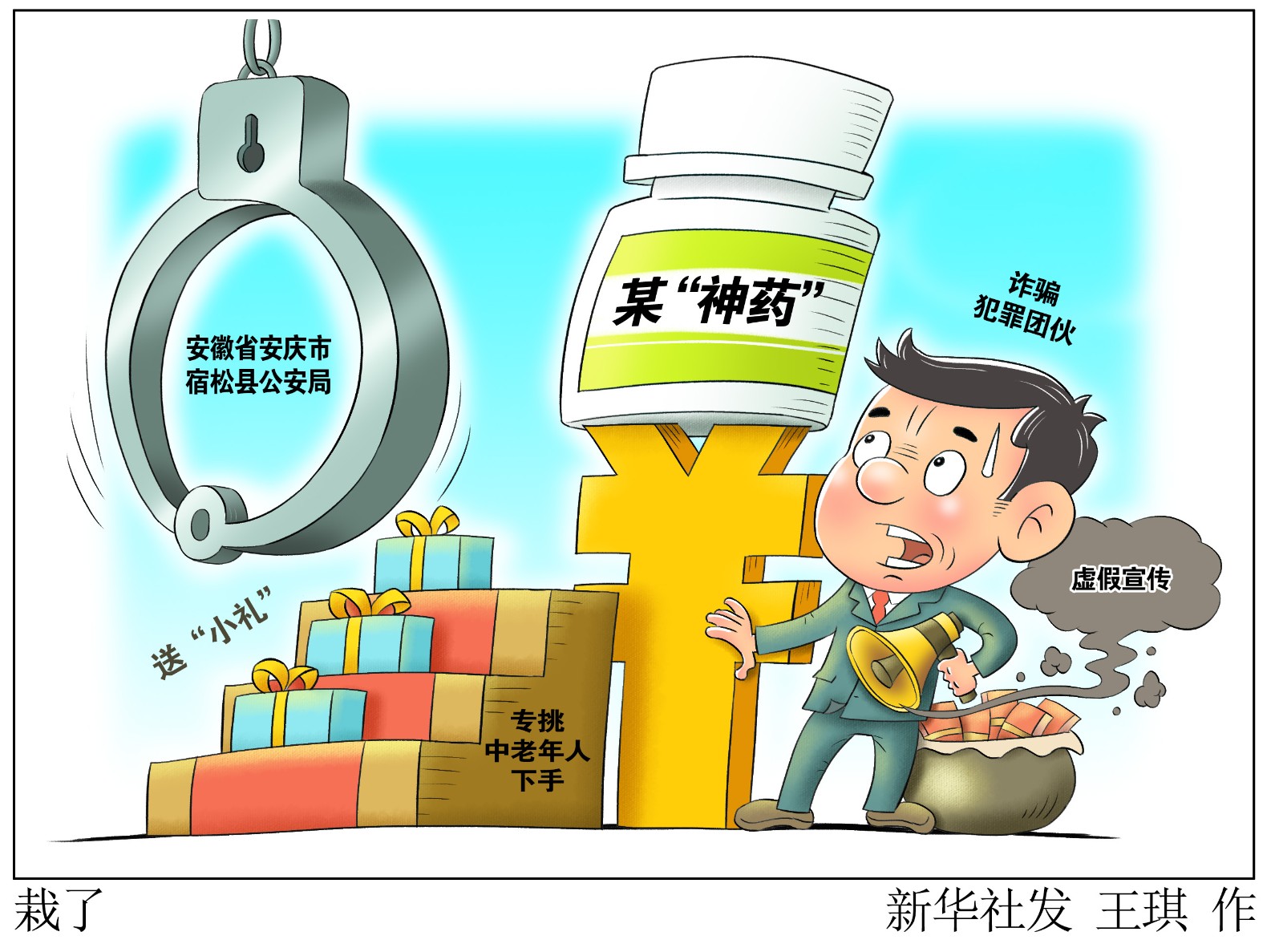 評書機、老人鞋等“小禮”請先笑納,“包治百病”的“神藥”快來試試?小心“騙你沒商量”!記者日前從安徽省安慶市宿松縣公安局了解到,當?shù)鼐酱虻粢粋€向中老年群體虛假宣傳兜售藥品進行詐騙的犯罪團伙,全國多地數(shù)千人上當,涉案金額近千萬元。