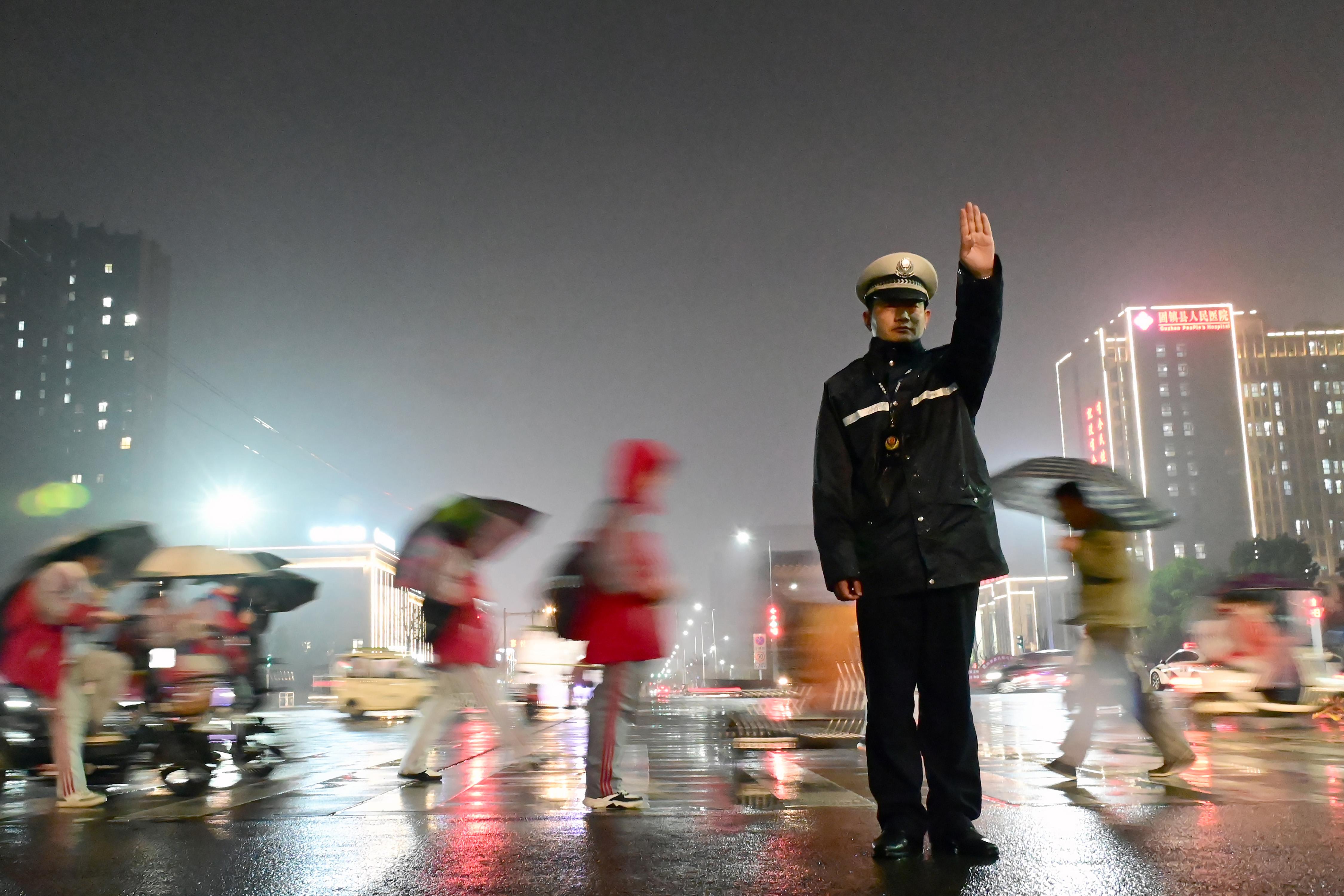 3月22日晚,安徽省固鎮(zhèn)縣公安局交管大隊民警冒雨在第三中學(xué)路段指揮疏導(dǎo)交通。針對中學(xué)生晚自習(xí)放學(xué)時間晚、出行集中情況,固鎮(zhèn)縣公安局交管大隊組織警力強化夜間“護(hù)學(xué)崗”,確保學(xué)生安全。