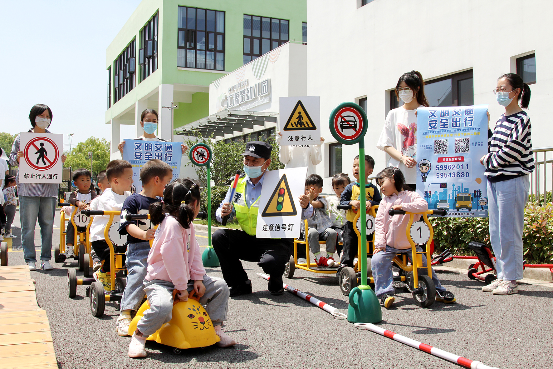 5月25日,上海市公安局嘉定分局婁塘派出所民警走進匯源路幼兒園,以安全兒歌、圖片標識、趣味搶答和交通情景游戲等形式,讓小朋友在游戲中學(xué)習(xí)交通法規(guī)。