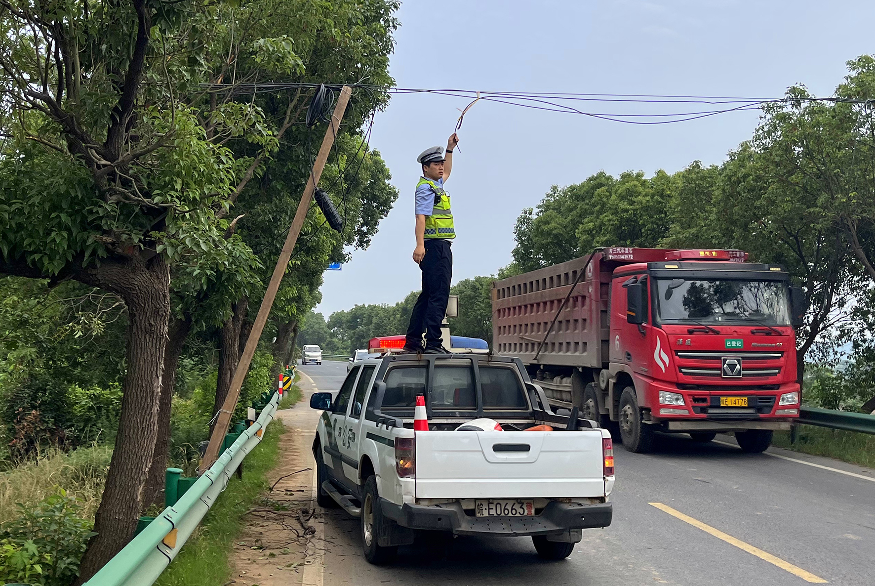 6月13日,安徽省當(dāng)涂縣青山路太白高速路段,一根電線桿被撞倒導(dǎo)致車輛無法正常通行。當(dāng)涂縣公安局交管大隊執(zhí)勤民警爬上警車用手托舉線纜,引導(dǎo)被堵車輛有序通行。