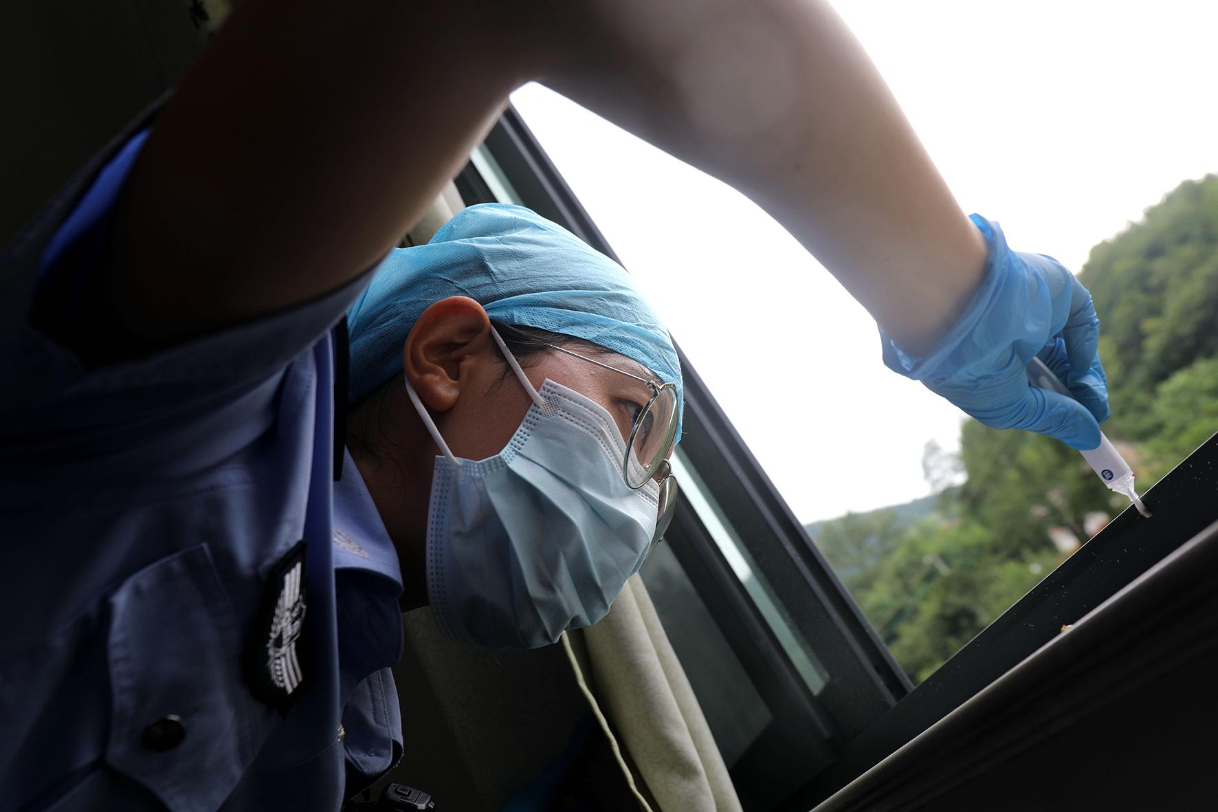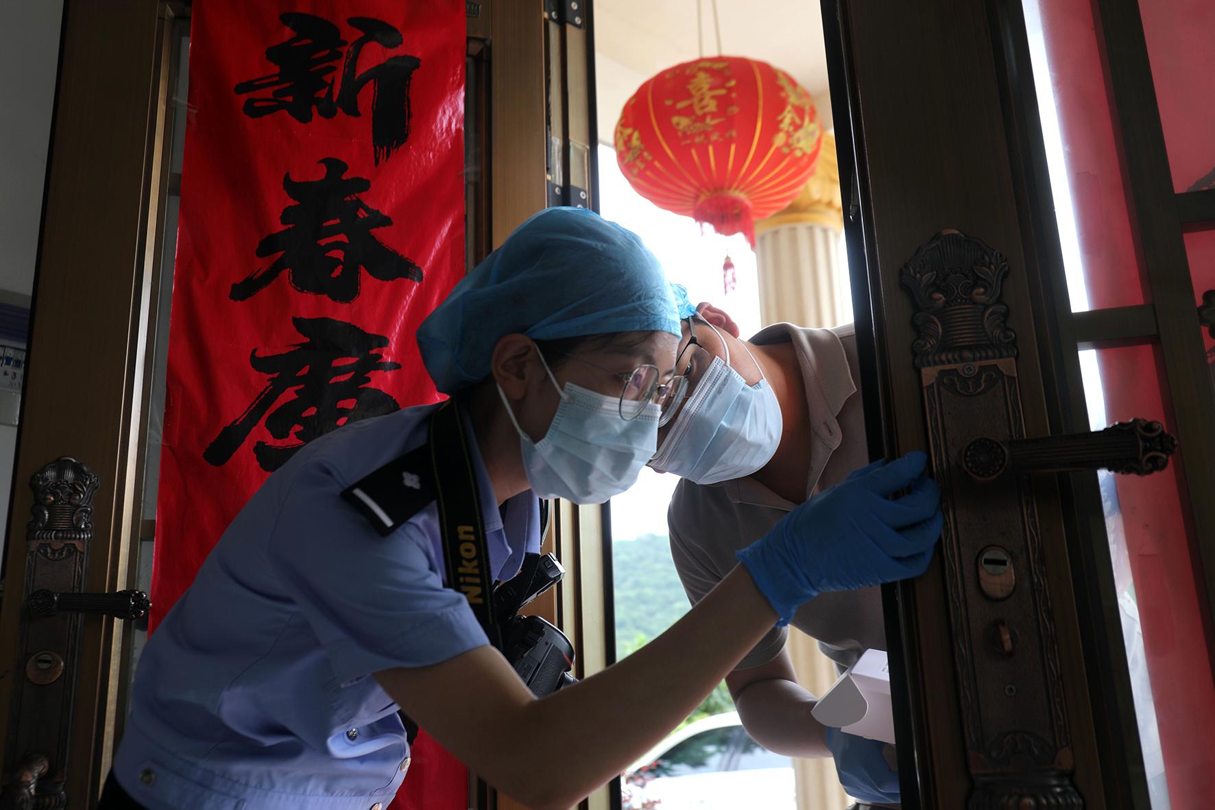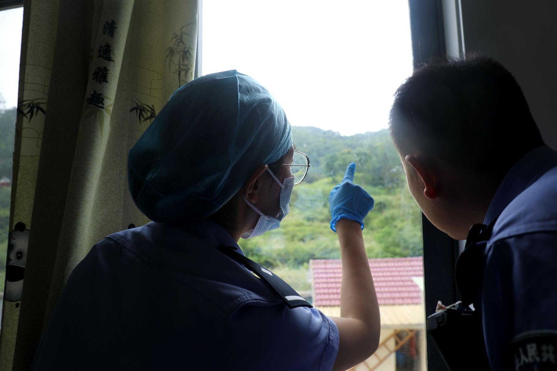 圖五、現(xiàn)場(chǎng)勘查結(jié)束,民警終于可以摘下頭套歇會(huì)兒。