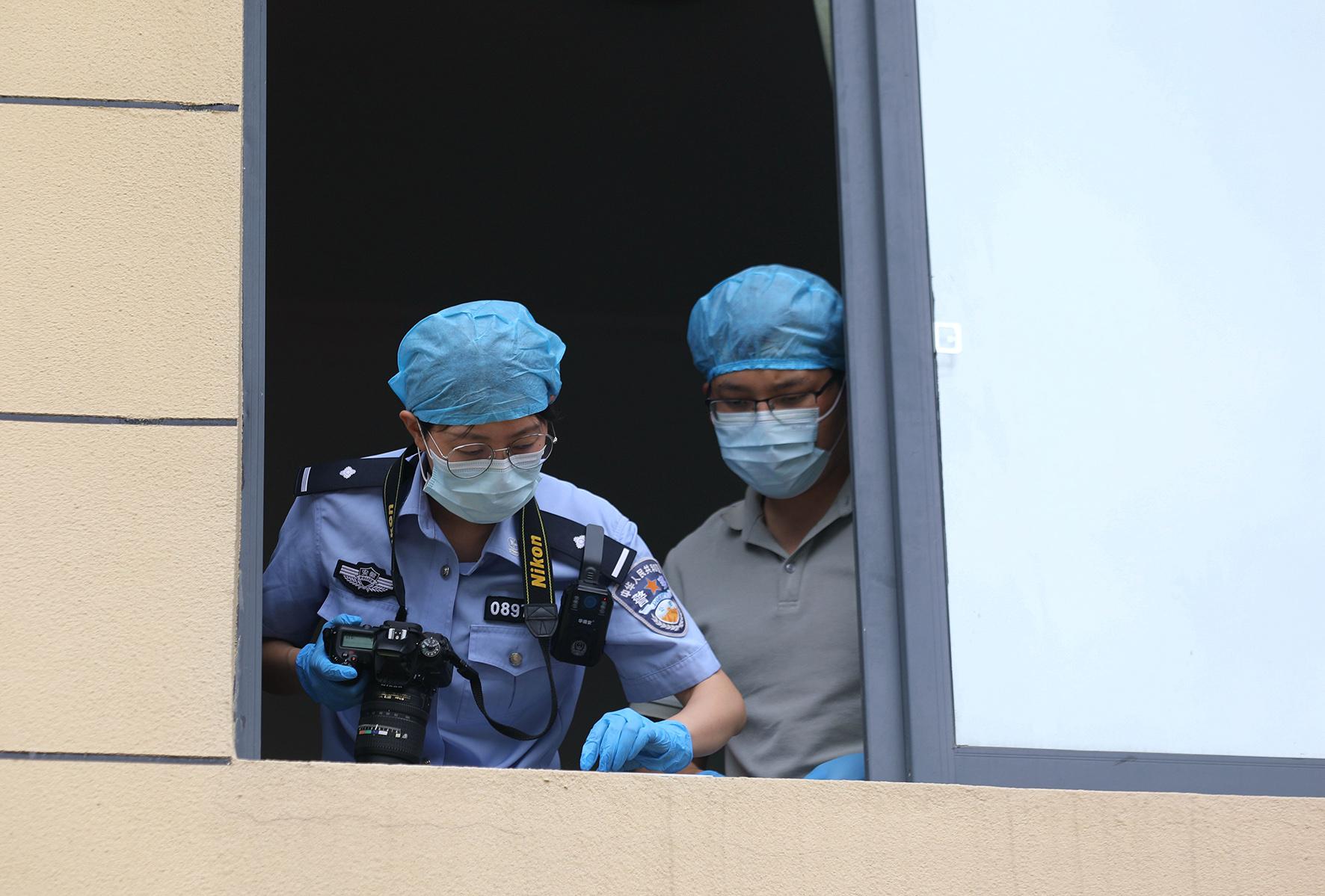 圖一、民警在中心現(xiàn)場(chǎng)對(duì)痕跡進(jìn)行勘查。