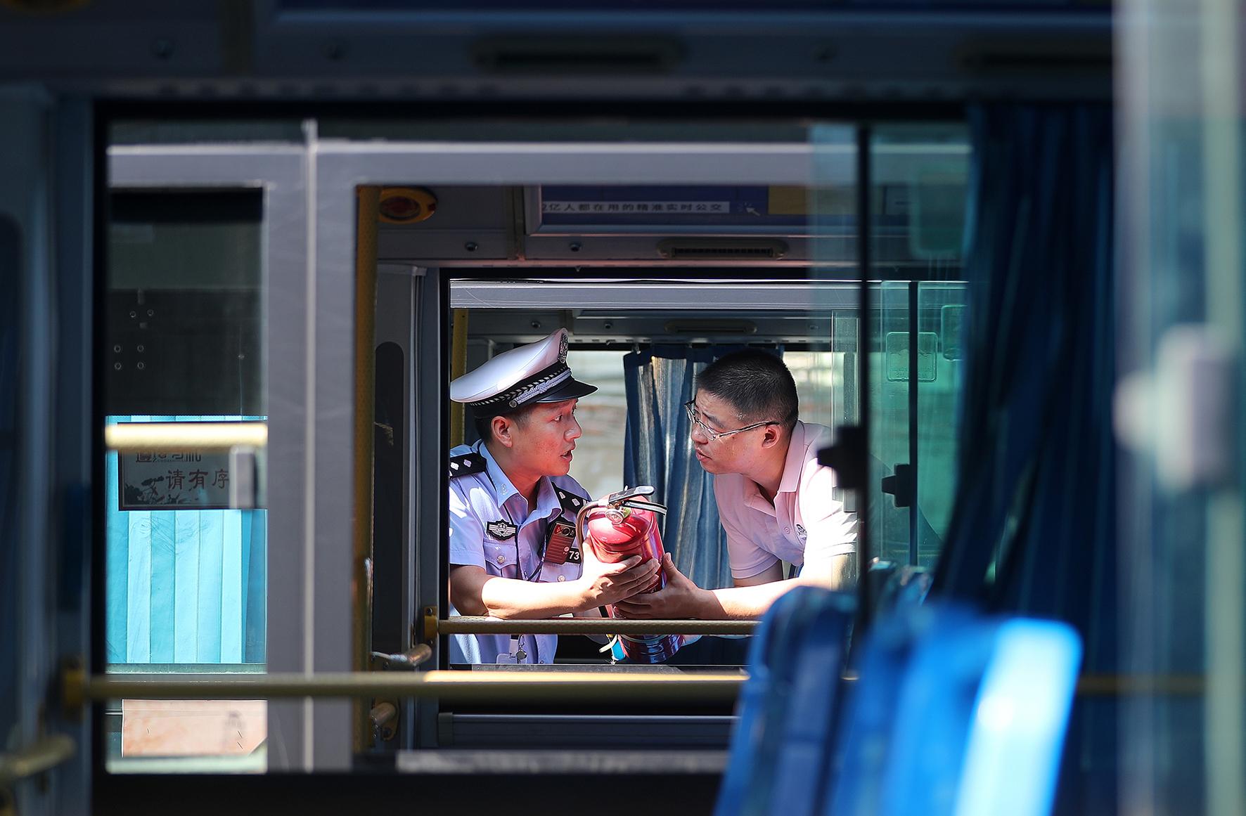 7月17日,湖北省荊門市公安局交警支隊民警仔細檢查公交車制動系統(tǒng)、逃生錘、安全帶、滅火器等安全設備。連日來,湖北天氣持續(xù)高溫,荊門市公安局交警支隊組織民警,對運行的公交車開展全面“體檢”,杜絕車輛“帶病”上路,確保群眾安全出行。