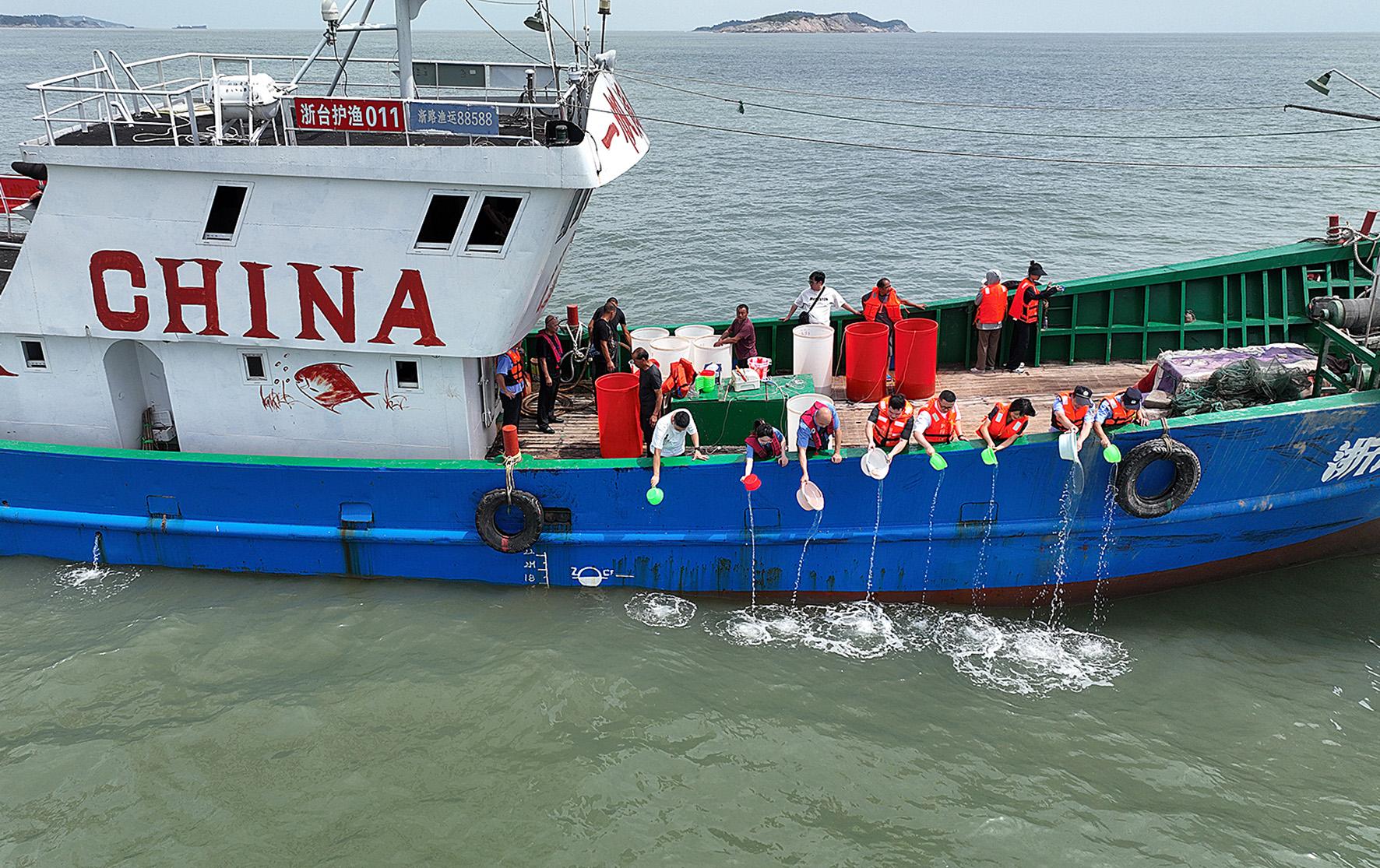 7月19日,在浙江省臺州市路橋區(qū)金清鎮(zhèn)近海海域,當(dāng)?shù)攸h員干部、政法干警、人大代表、政協(xié)委員、漁民代表等開展海洋增殖放流活動,向大海投放蝦苗2050萬尾。