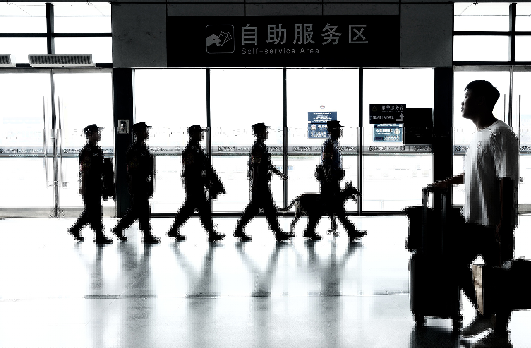 圖為8月8日,鷹潭公安處警犬工作隊民警在巡邏防控,并協(xié)同安檢查危。