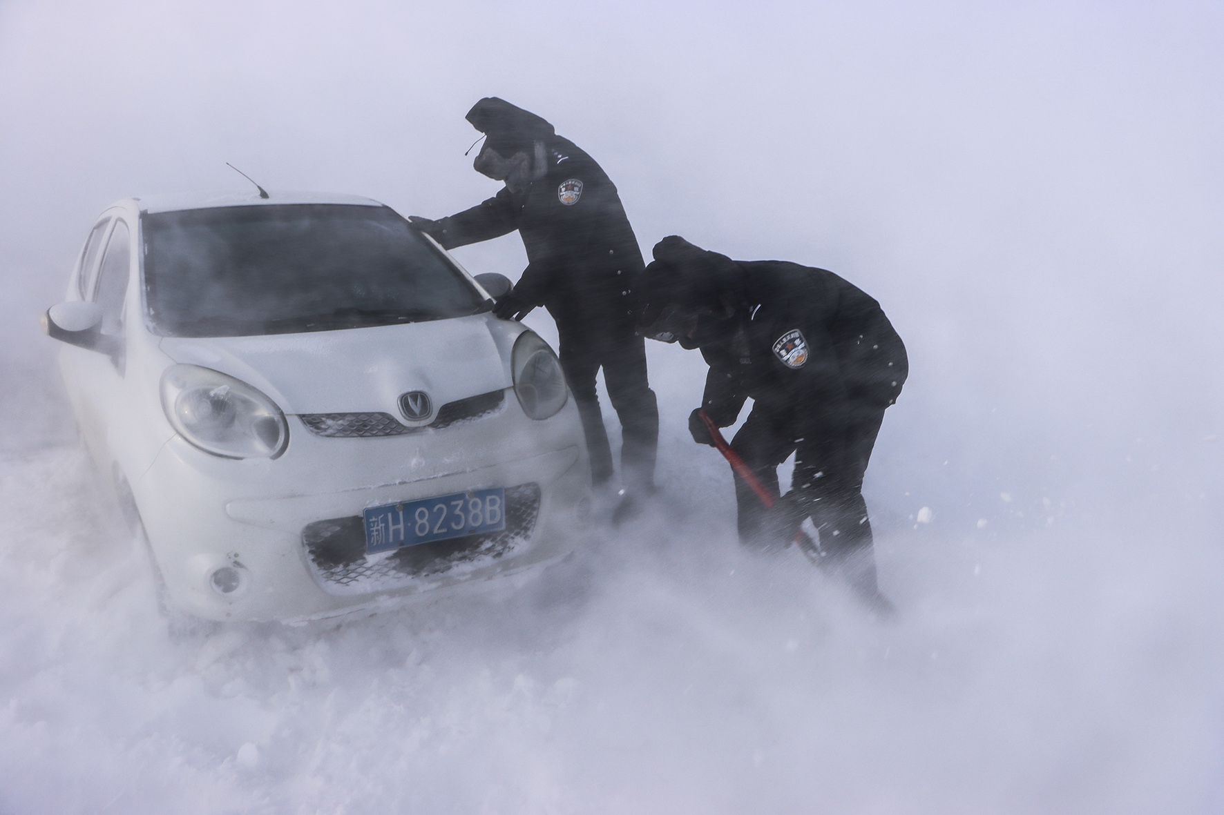 12月7日,新疆阿勒泰邊境管理支隊托斯特邊境派出所民警經(jīng)過1個小時的努力,將遭遇“風(fēng)吹雪”被困車輛安全救出。