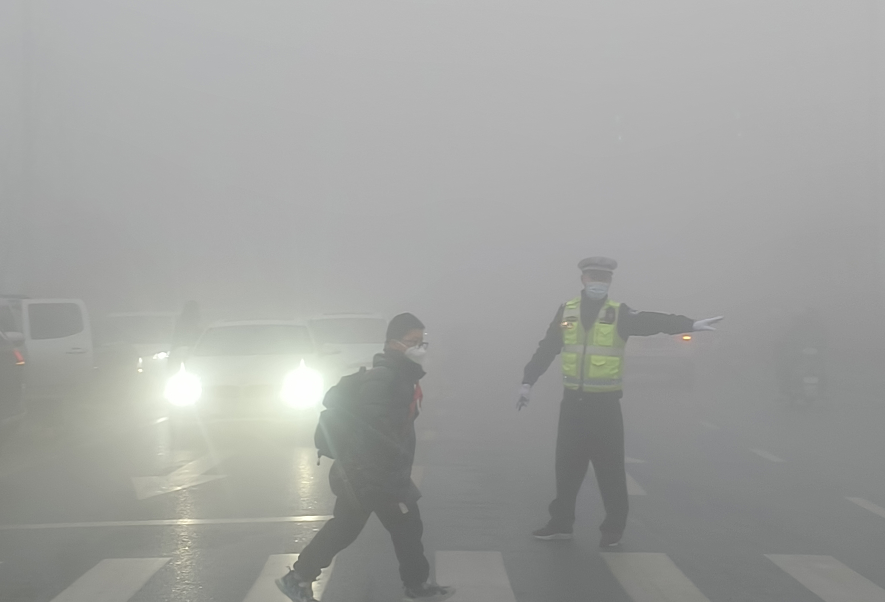 12月29日,安徽舒城普降大霧。舒城縣公安局交管大隊立即啟動惡劣天氣應急預案,組織警力加強對學校周邊路口的交通疏導,站好“護學崗”。