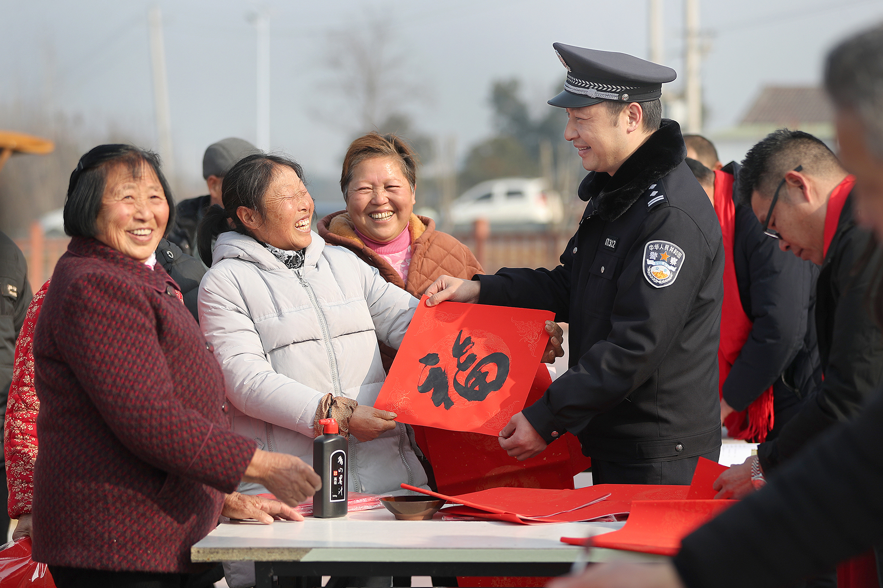 1月12日,在湖北省掇刀區(qū)團(tuán)林鋪鎮(zhèn)合星村,荊門市公安局高新區(qū)·掇刀區(qū)分局團(tuán)林派出所民警向村里老人送上“平安?!?。