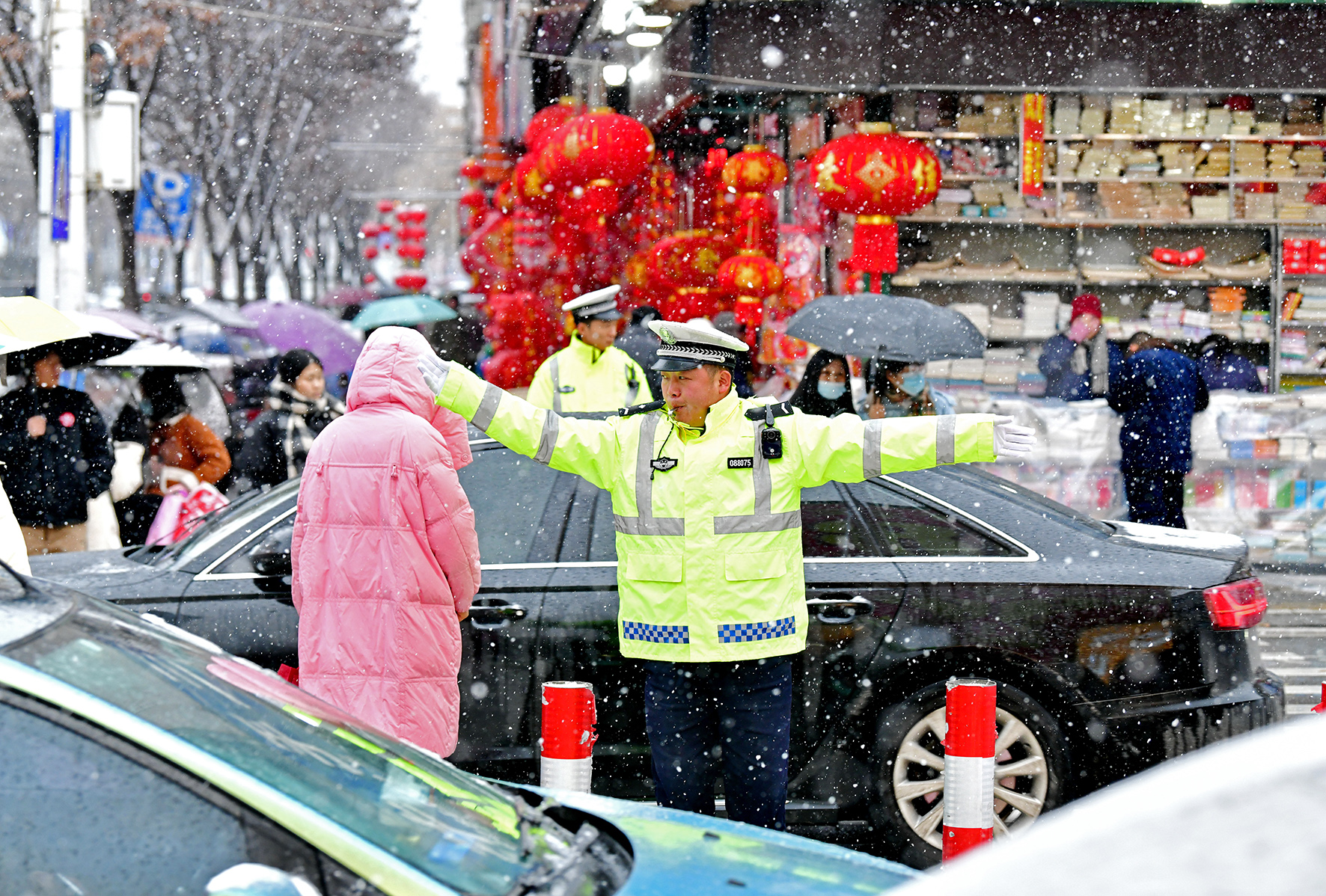 2月1日,安徽省阜南縣交警在城區(qū)年貨街路口維持交通秩序。當日,阜南縣公安局交管大隊啟動春運雨雪惡劣天氣道路交通應急預案,在城區(qū)主要路口設置高峰崗、國省道路段加大巡邏力度,確保群眾節(jié)日期間出行安全暢通。