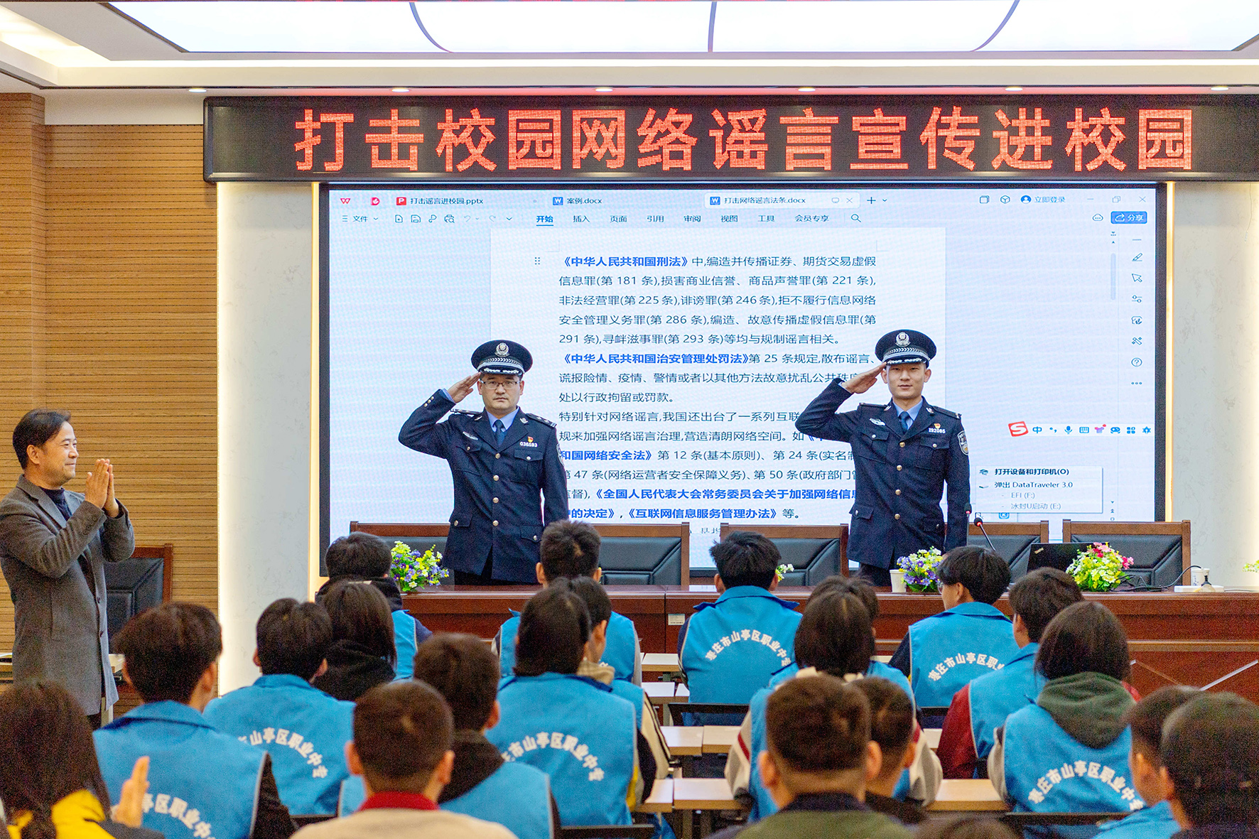 3月19日,山東省棗莊市公安局山亭分局網(wǎng)安大隊(duì)民警走進(jìn)山亭區(qū)職業(yè)中專,警校聯(lián)手開展“打擊整治網(wǎng)絡(luò)謠言宣傳進(jìn)校園”主題活動(dòng)。