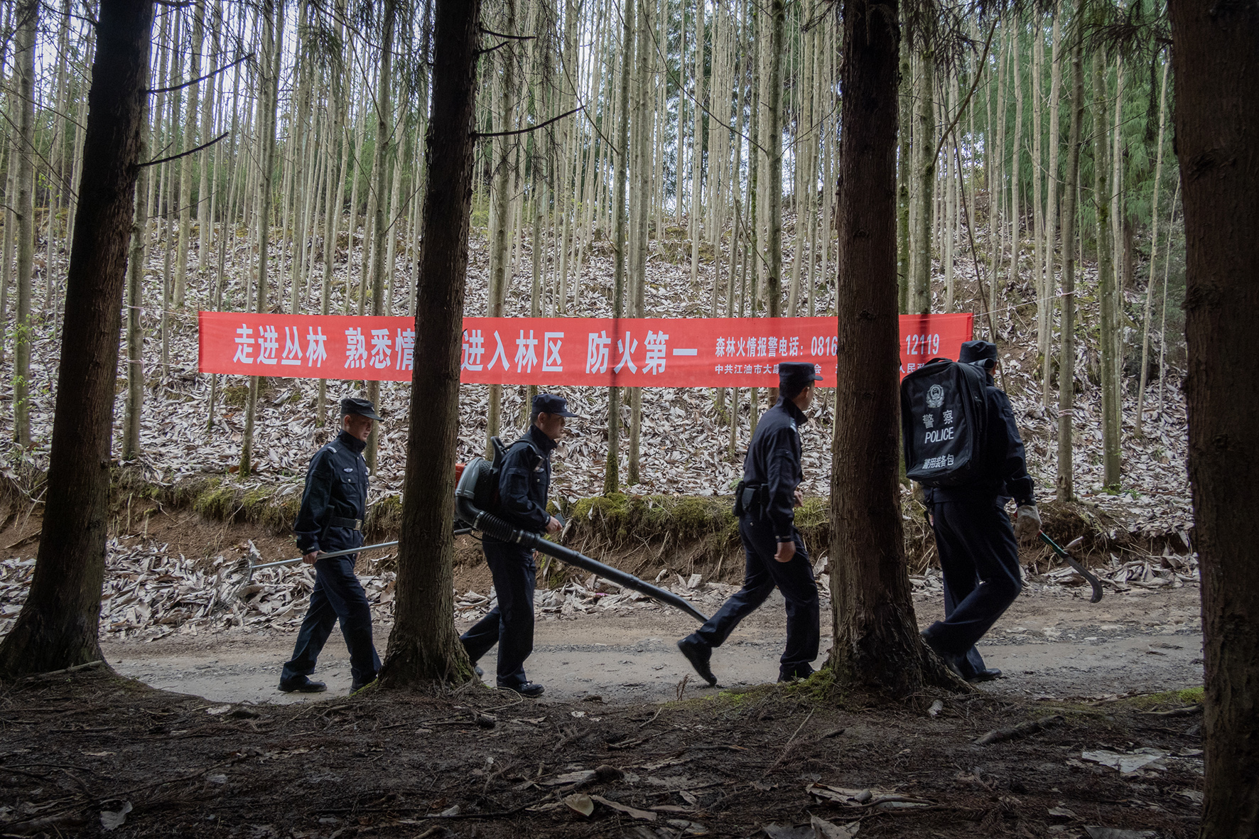 圖為4月7日,巡邏隊員在巡山護林,并向游客和村民講解防火知識。