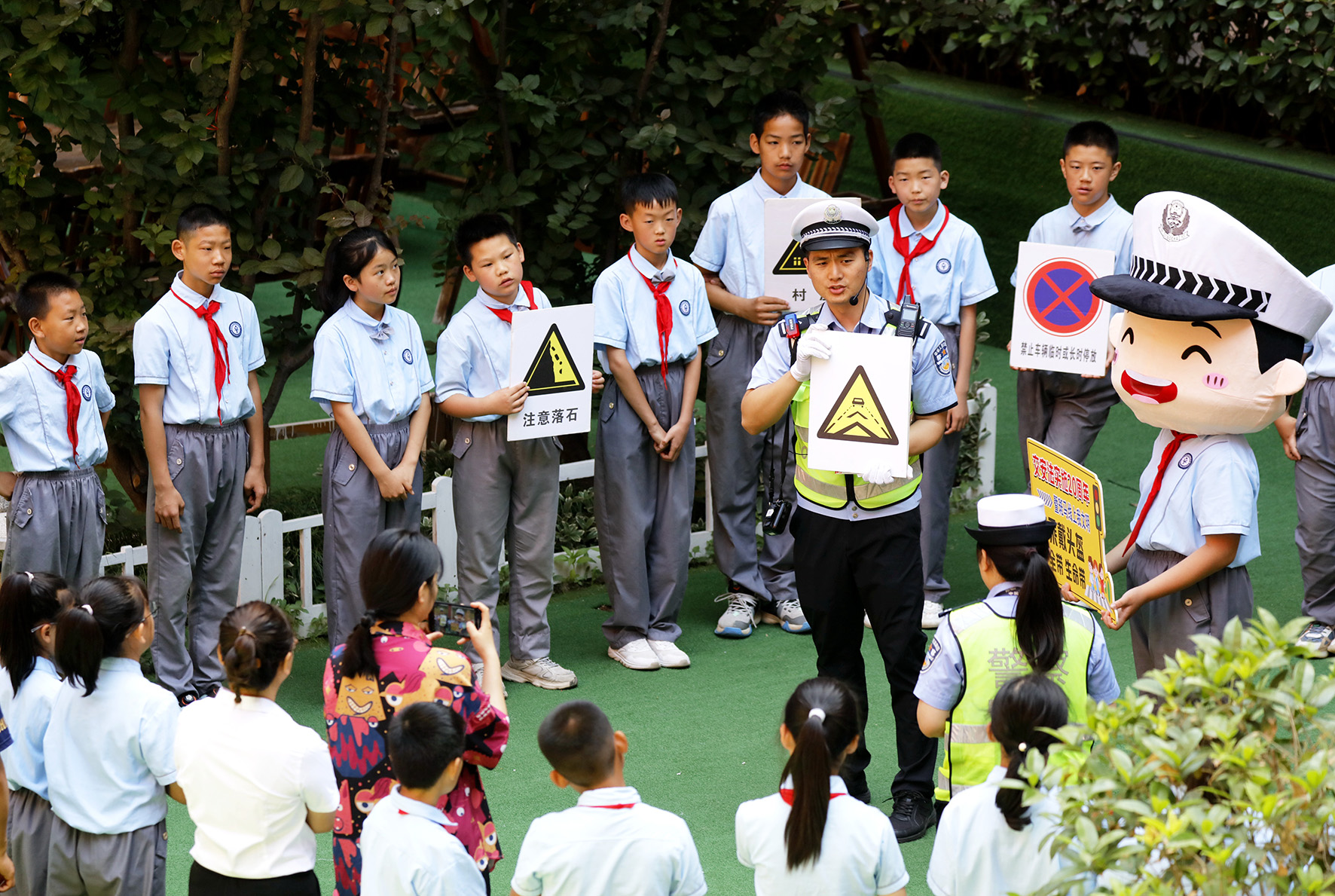在交通安全法實(shí)施20周年之際,5月16日,陜西省渭南市公安局交警支隊臨渭大隊民警與卡通人偶給小學(xué)生普及交通安全知識。