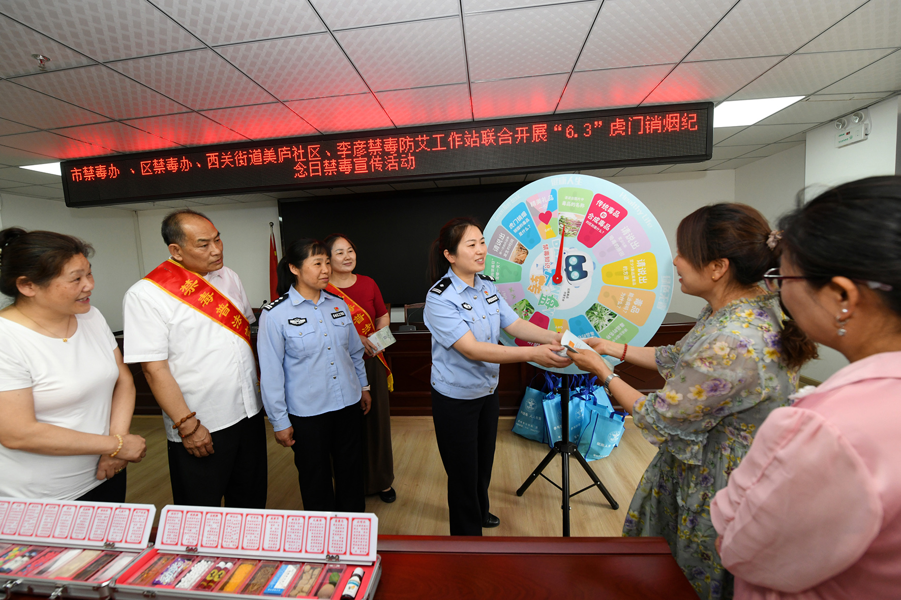 6月3日,安徽宿州市埇橋區(qū)西關(guān)街道美廬社區(qū),民警、禁毒志愿者和居民共同參與“大轉(zhuǎn)盤”禁毒游戲。當(dāng)日,是虎門銷煙185周年紀(jì)念日。宿州市公安局禁毒辦、埇橋公安分局禁毒辦、西關(guān)街道、李彥防艾禁毒工作站聯(lián)合開(kāi)展“遠(yuǎn)離毒品 無(wú)毒社區(qū)”禁毒普法宣傳活動(dòng),通過(guò)“大轉(zhuǎn)盤”游戲、播放短視頻、發(fā)放禁毒宣傳彩頁(yè)、講解新型毒品特點(diǎn)與危害,提升廣大社區(qū)居民識(shí)毒、防毒、拒毒意識(shí),自覺(jué)抵制毒品侵害。