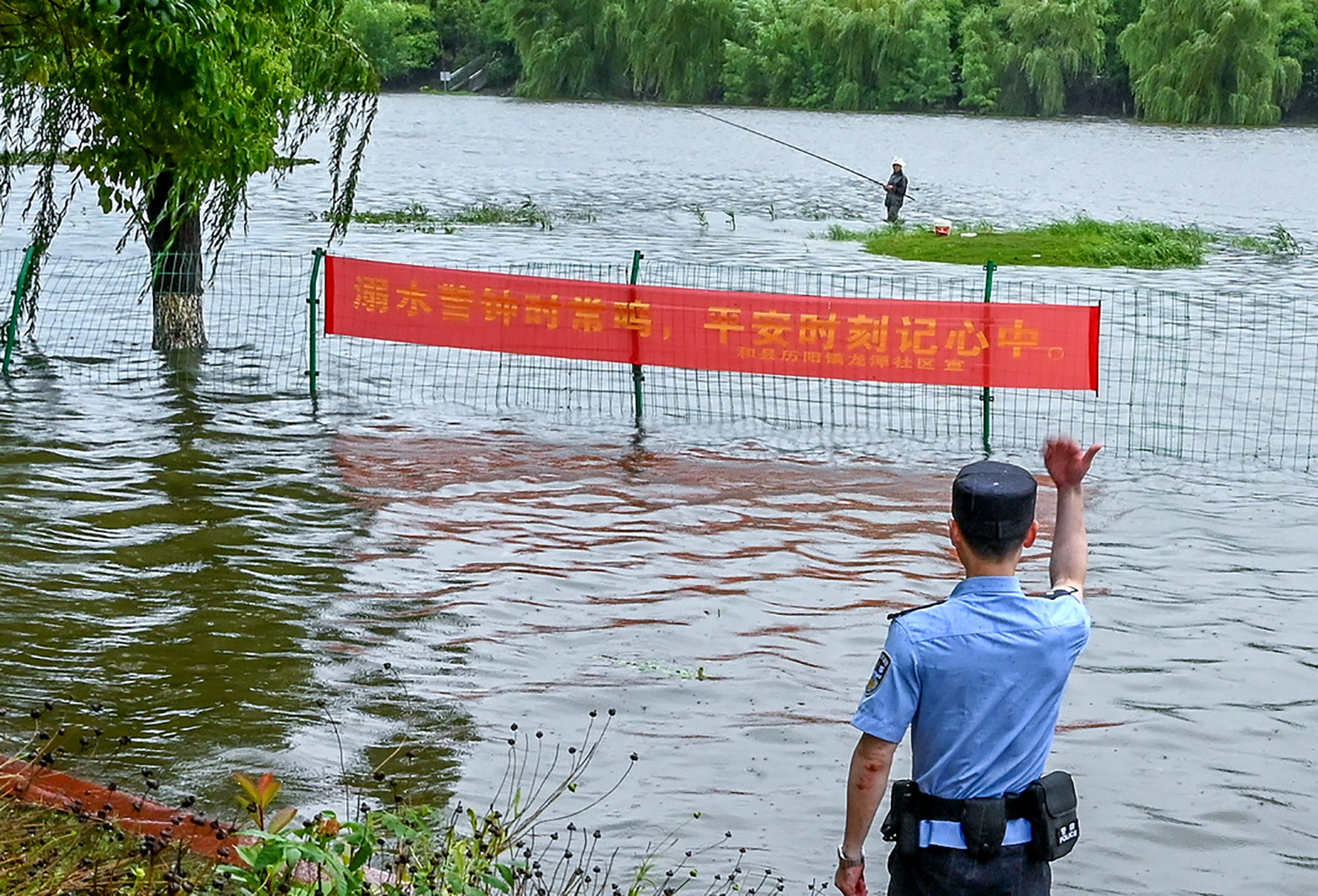 7月2日,安徽省馬鞍山市和縣公安局歷陽派出所民警在得勝河邊勸離一名垂釣人立即離開危險水域。當(dāng)天,該河水位迅速上漲已超警戒水位,當(dāng)?shù)胤姥磻?yīng)急響應(yīng)已提升至三級。