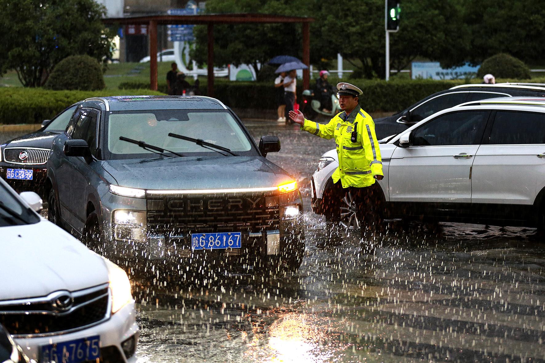圖為民警在長(zhǎng)江路積水路段指揮疏導(dǎo)交通。