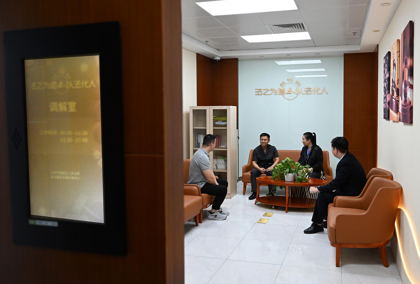 在月壇派出所調(diào)解室,法官趙海(中)圍繞人民調(diào)解協(xié)議中常見糾紛類型、遇到的共性問題給兩位調(diào)解員進行專業(yè)指導。
