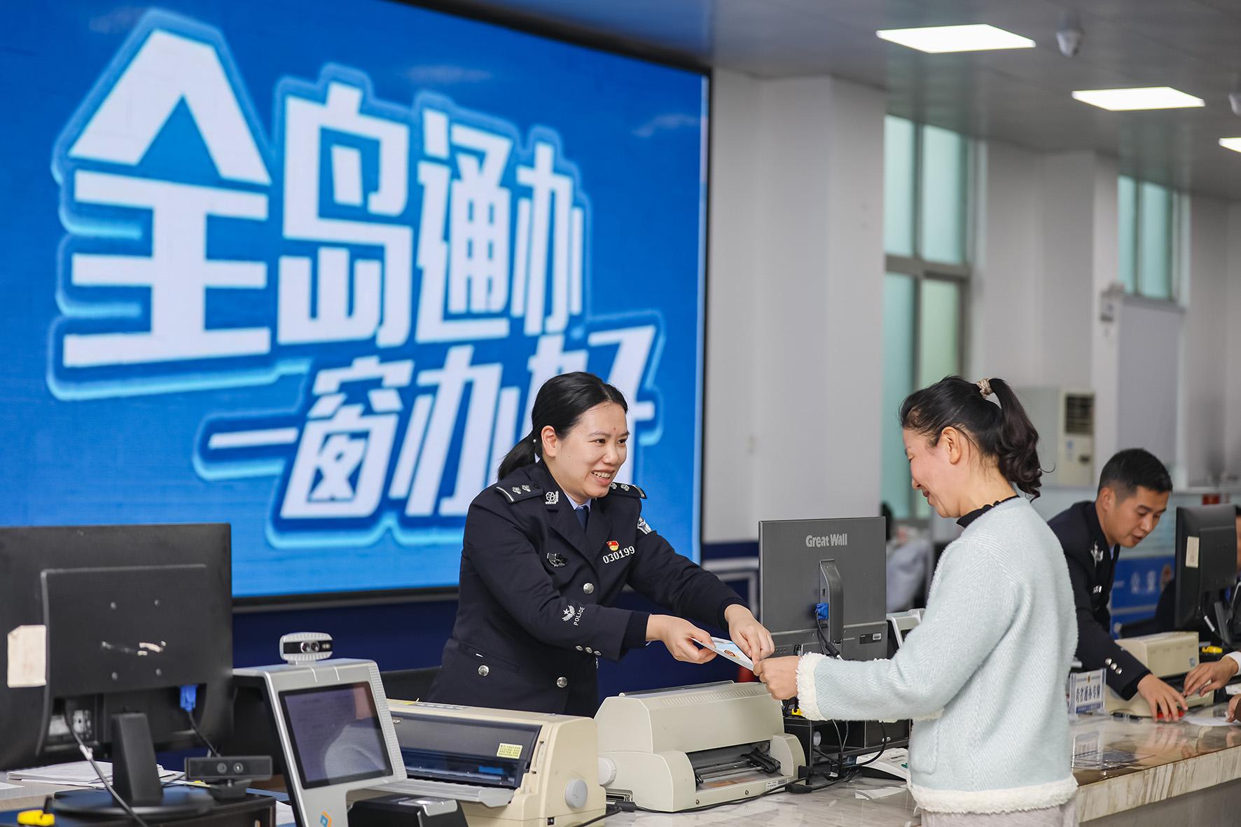 圖為1月6日,平潭綜合實驗區(qū)公安局海壇服務(wù)中心民警正在給群眾辦理戶政業(yè)務(wù)。