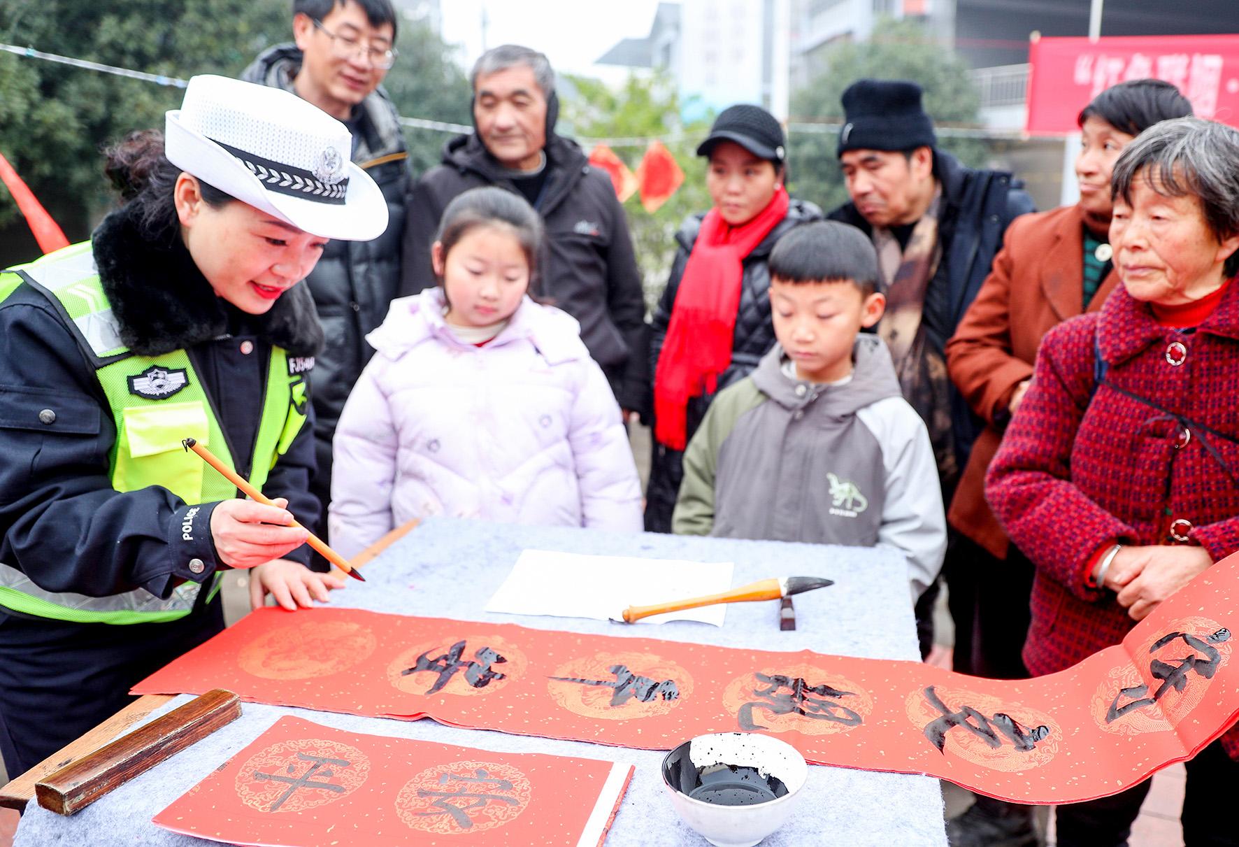 1月15日,四川省華鎣市公安局交通警察大隊(duì)的書法愛好者,在永興鎮(zhèn)馬架坪村文體廣場,為群眾書寫“平安春聯(lián)”。