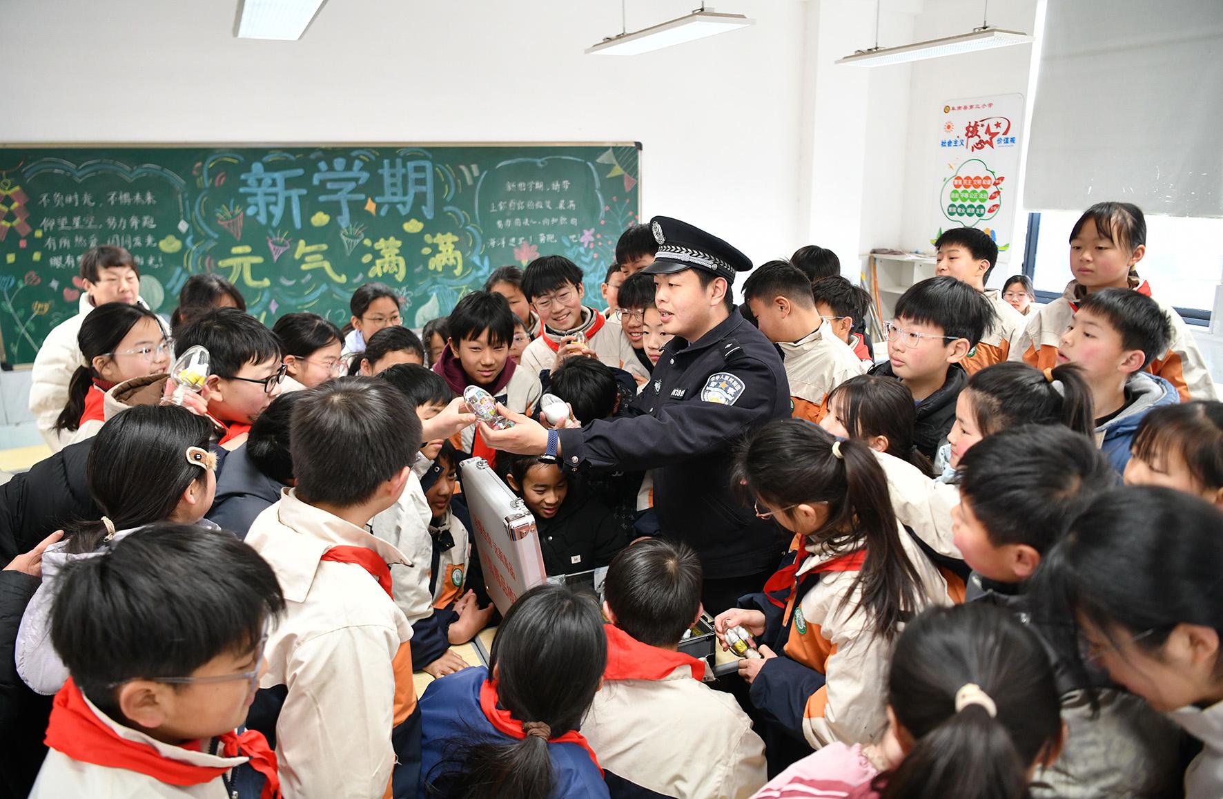 2月18日,安徽省阜南縣公安局城關(guān)派出所民警在第三小學(xué)利用仿真毒品模型向?qū)W生們講解毒品的危害性。開學(xué)之際,阜南縣公安局城關(guān)派出所組織民警走進(jìn)轄區(qū)中小學(xué)校上好“禁毒第一課”。