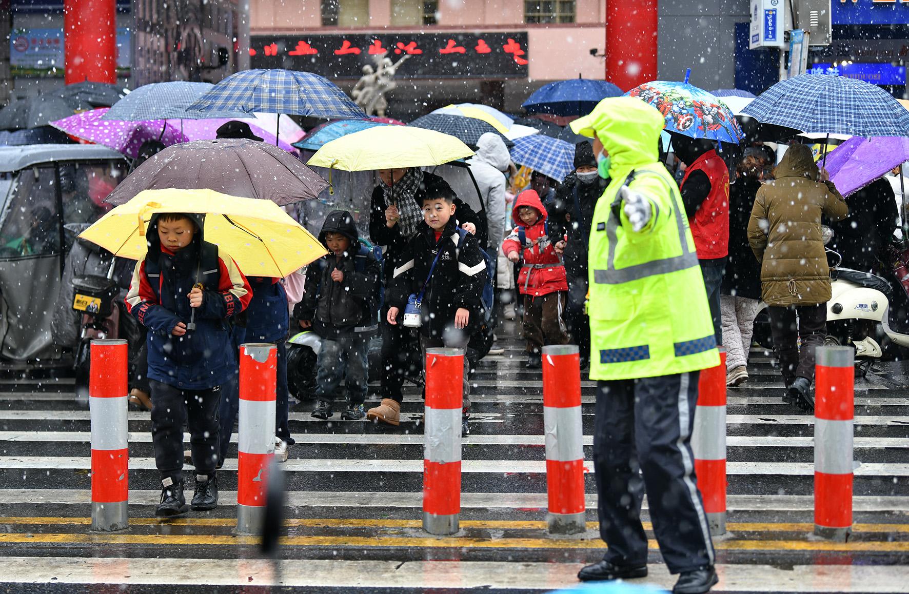 3月3日,安徽省阜南縣公安局交管大隊(duì)民警冒著風(fēng)雪在城區(qū)一小學(xué)門(mén)口維持交通秩序。