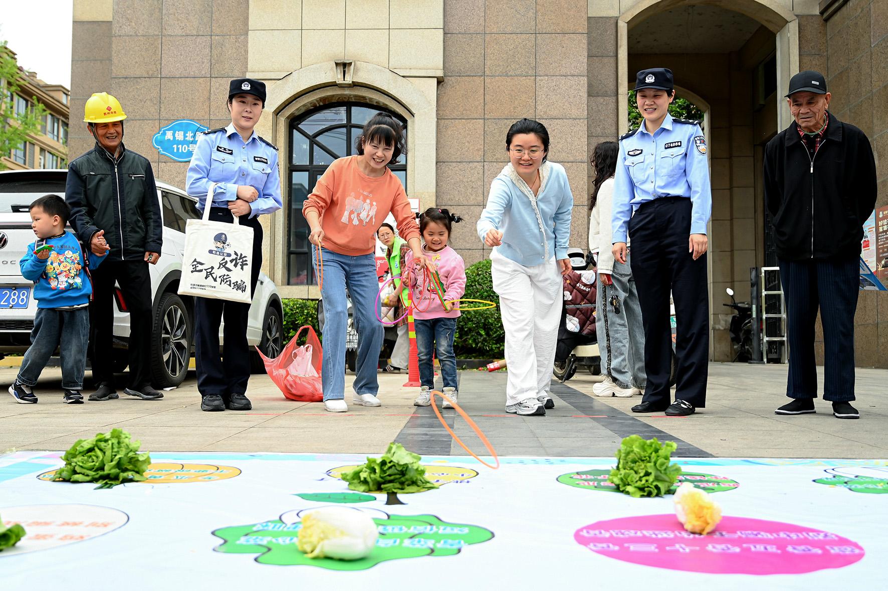 圖為群眾在印有“詐騙套路”的地墊上進(jìn)行有獎(jiǎng)套圈活動。