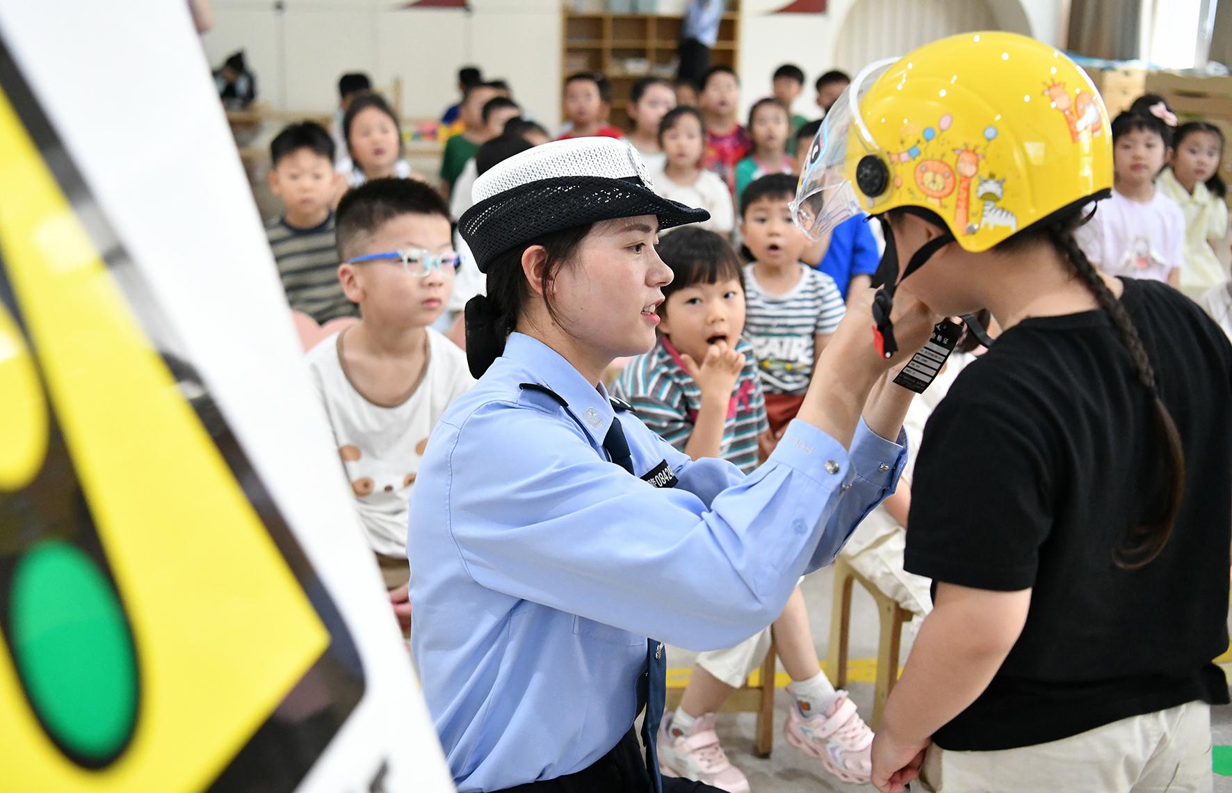 6月11日,安徽省阜南縣公安局交管大隊(duì)民輔警走進(jìn)轄區(qū)幼兒園開展“文明交通 安全‘童’行”宣傳活動(dòng)。
