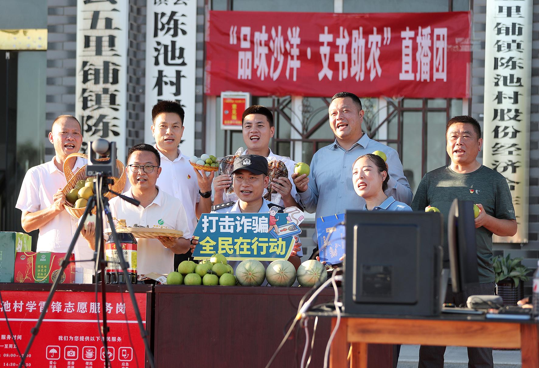 7月3日傍晚,在湖北省沙洋縣五里鋪鎮(zhèn)陳池村,沙洋縣公安局五里派出所民警和7位村支書,通過網(wǎng)絡(luò)直播的形式向千家萬戶開展反詐禁毒宣傳。