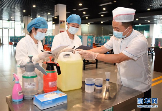 8月9日,在北京交通大學(xué)學(xué)生第二食堂,校醫(yī)院醫(yī)護(hù)人員(左、中)指導(dǎo)食堂工作人員進(jìn)行消毒工作。