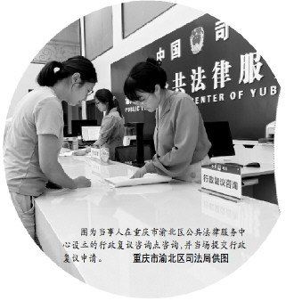 圖為當(dāng)事人在重慶市渝北區(qū)公共法律服務(wù)中心設(shè)立的行政復(fù)議咨詢點咨詢,并當(dāng)場提交行政復(fù)議申請。