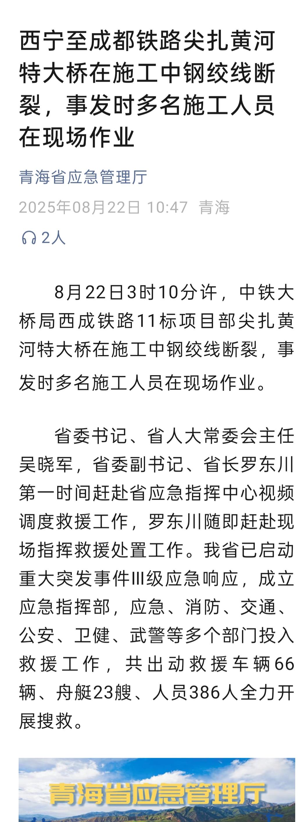 青海省應(yīng)急管理廳通報(bào)稱,8月22日3時(shí)10分許,中鐵大橋局西成鐵路11標(biāo)項(xiàng)目部尖扎黃河特大橋在施工中鋼絞線斷裂,事發(fā)時(shí)多名施工人員在現(xiàn)場(chǎng)作業(yè)。青海省委書記、省人大常委會(huì)主任吳曉軍,省委副書記、省長(zhǎng)羅東川第一時(shí)間趕赴省應(yīng)急指揮中心視頻調(diào)度救援工作,羅東川隨即趕赴現(xiàn)場(chǎng)指揮救援處置工作。青海省已啟動(dòng)重大突發(fā)事件Ⅲ級(jí)應(yīng)急響應(yīng),成立應(yīng)急指揮部,應(yīng)急、消防、交通、公安、衛(wèi)健、武警等多個(gè)部門投入救援工作,共出動(dòng)救援車輛66輛、舟艇23艘、人員386人全力開展搜救。