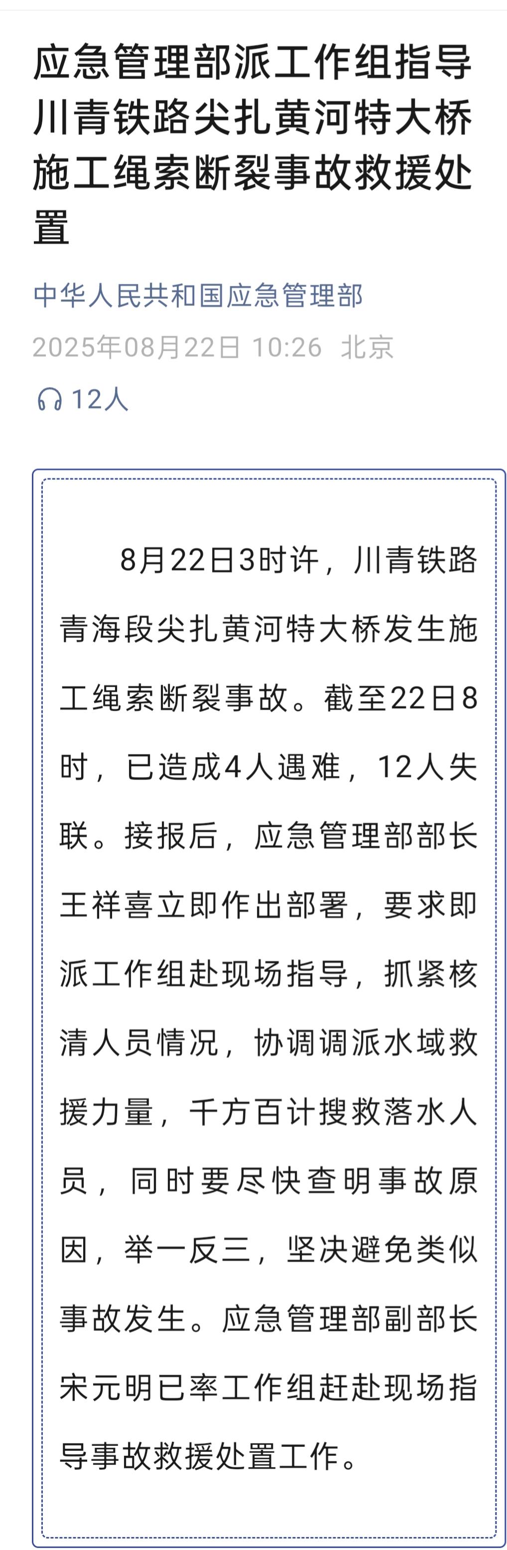 8月22日,應(yīng)急管理部發(fā)布消息,8月22日3時(shí)許,川青鐵路青海段尖扎黃河特大橋發(fā)生施工繩索斷裂事故。截至22日8時(shí),已造成4人遇難,12人失聯(lián)。接報(bào)后,應(yīng)急管理部部長(zhǎng)王祥喜立即作出部署,要求即派工作組赴現(xiàn)場(chǎng)指導(dǎo),抓緊核清人員情況,協(xié)調(diào)調(diào)派水域救援力量,千方百計(jì)搜救落水人員,同時(shí)要盡快查明事故原因,舉一反三,堅(jiān)決避免類似事故發(fā)生。應(yīng)急管理部副部長(zhǎng)宋元明已率工作組趕赴現(xiàn)場(chǎng)指導(dǎo)事故救援處置工作。