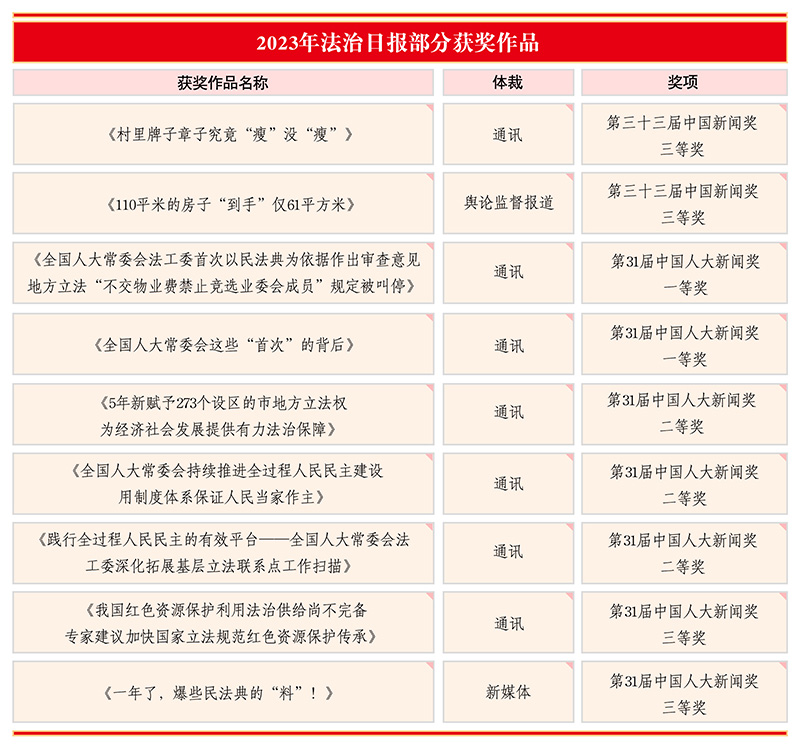 2023年,報(bào)社2件作品獲得第三十三屆中國新聞獎(jiǎng)三等獎(jiǎng),7件作品分獲第31屆中國人大新聞獎(jiǎng)一、二、三等獎(jiǎng),1個(gè)專題獲評(píng)“2023中國正能量網(wǎng)絡(luò)精品”,1件作品獲得第十八屆全國法治動(dòng)漫微視頻作品征集活動(dòng)三等獎(jiǎng);3個(gè)黨支部被中央和國家機(jī)關(guān)工委評(píng)為“四強(qiáng)”黨支部。