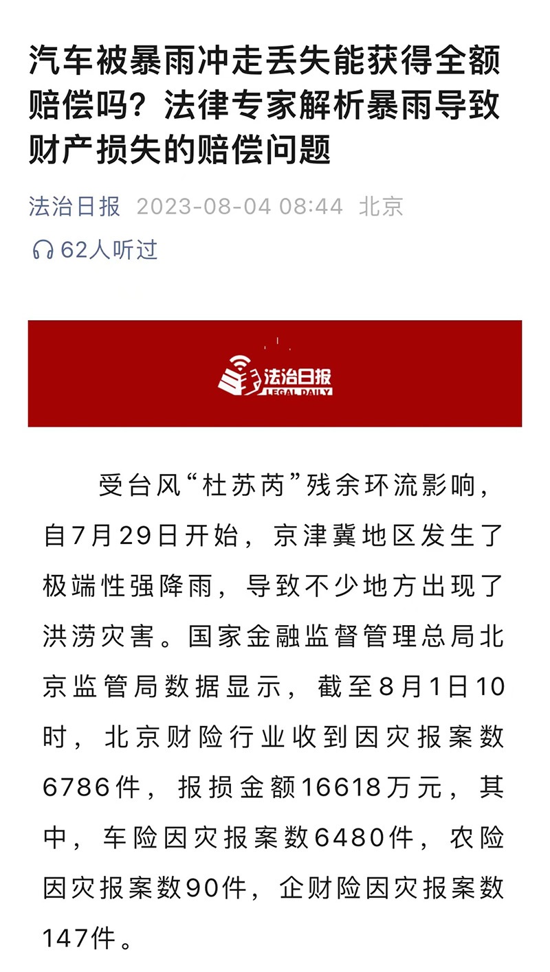 《汽車被暴雨沖走丟失能獲得全額賠償嗎?法律專家解析暴雨導(dǎo)致財(cái)產(chǎn)損失的賠償問題》一稿及時(shí)解惑普法,閱讀量迅速突破10萬+