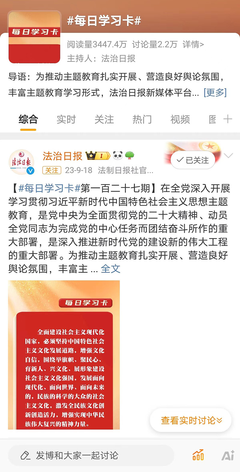 為豐富主題教育形式,法治日?qǐng)?bào)微博開設(shè)#每日學(xué)習(xí)卡#原創(chuàng)話題,以圖卡形式陸續(xù)推送《習(xí)近平著作選讀》《習(xí)近平新時(shí)代中國特色社會(huì)主義思想專題摘編》等著作中的重要論述。自2023年5月中旬至9月底共推送138期內(nèi)容