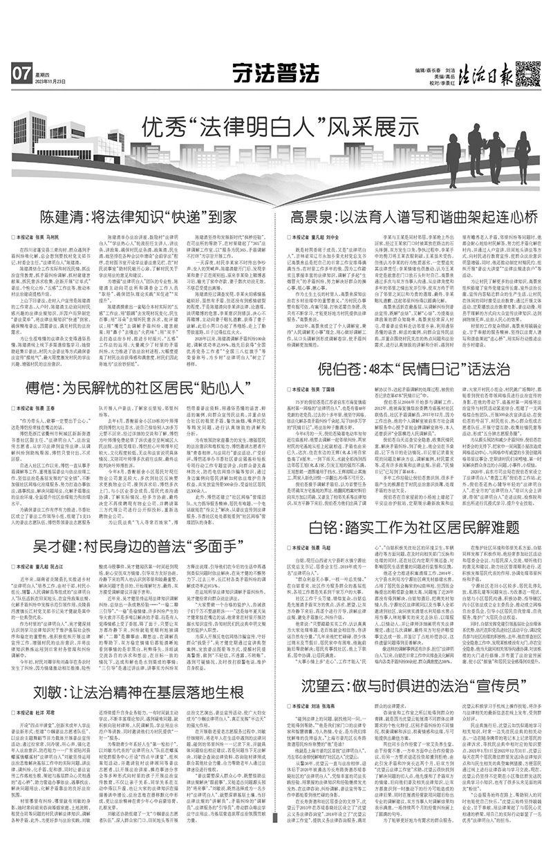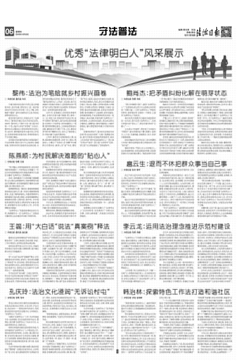 將更多筆墨對(duì)準(zhǔn)基層一線,推出一系列有態(tài)度、有溫度、有力度、有深度的新聞報(bào)道?!斗ㄖ稳?qǐng)?bào)》用3個(gè)專版集中展示優(yōu)秀“法律明白人”扎根基層、助力社會(huì)治理的生動(dòng)故事?!斗ㄖ稳?qǐng)?bào)·社區(qū)版》全年共推出52塊“平安中國·身影”版,展現(xiàn)170余名基層法治工作者的堅(jiān)持、付出與擔(dān)當(dāng)。