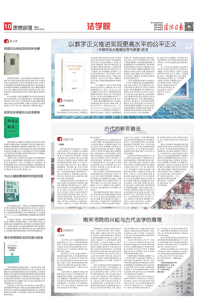 深耕法治文化,弘揚(yáng)法治精神。法學(xué)院專刊開設(shè)“法律文化”“史海鉤沉”“書林臧否”“畢業(yè)典禮致辭”等欄目,弘揚(yáng)中華優(yōu)秀傳統(tǒng)法律文化,介紹優(yōu)秀法治文化類圖書書評(píng)、書序,反映我國高校法學(xué)教育蒸蒸日上圖景。《法治日?qǐng)?bào)·社區(qū)版》“法治文化”版2023年刊發(fā)300余篇(幅)基層政法工作者創(chuàng)作的文藝作品,為基層文化建設(shè)提供展示平臺(tái)。