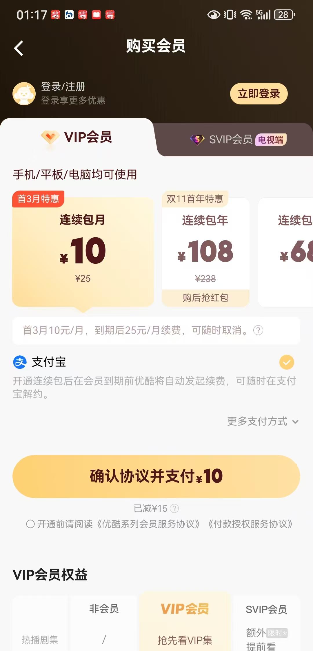 優(yōu)酷視頻APP的VIP會(huì)員注冊(cè)頁(yè)面中,首先映入眼簾的是醒目的“首3月特惠”紅底白字字體,后面“連續(xù)包月10元”的字體也是大號(hào)加黑非常醒目,然而“首3月10元/月,到期后25元/月續(xù)費(fèi),可隨時(shí)取消”的提示卻是稍不注意便會(huì)忽略的淺色小字;在“連續(xù)包年108元”醒目字體下面,也是淺色小字的自動(dòng)續(xù)費(fèi)提示“首年108元/年,到期后238元/年續(xù)費(fèi),可隨時(shí)取消”。