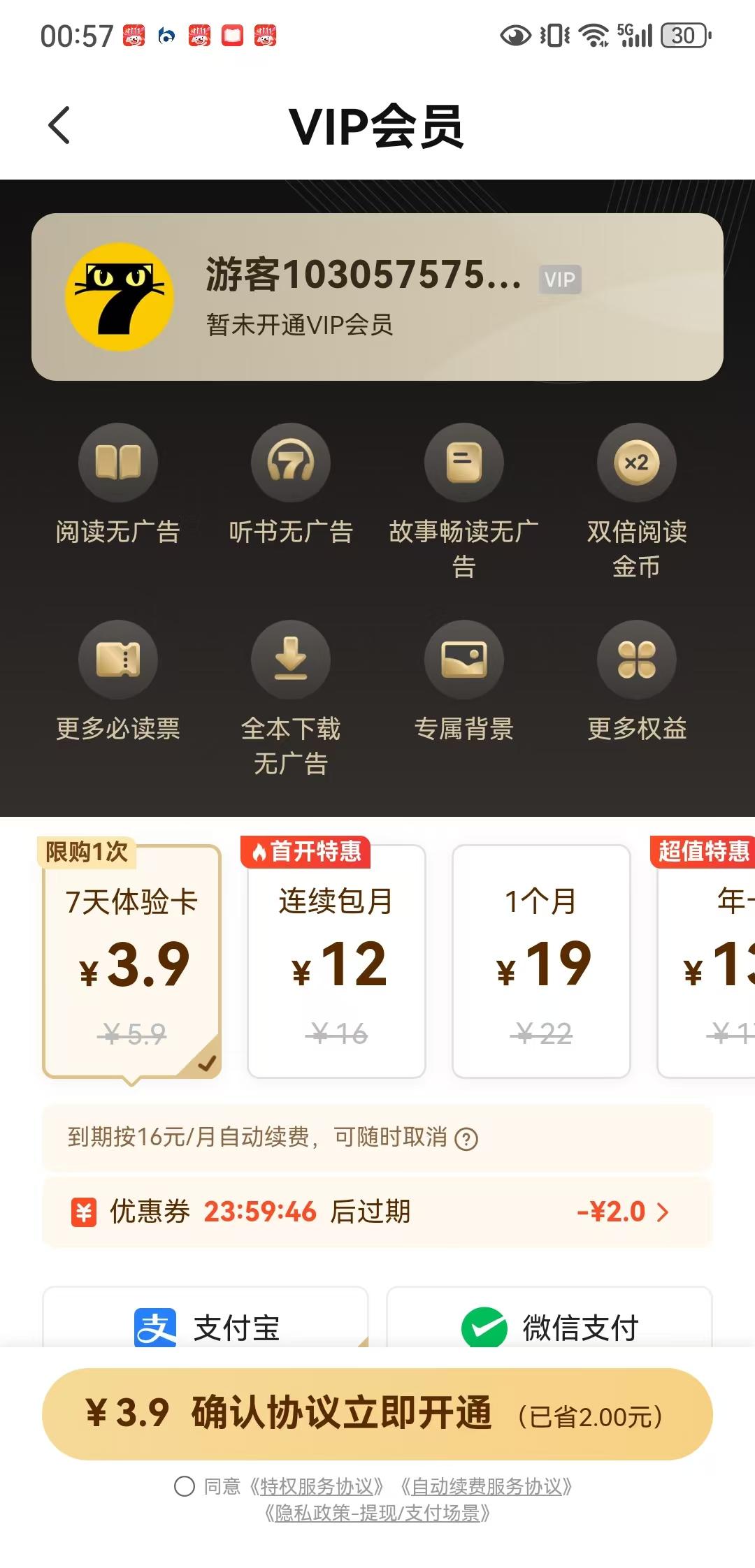 打開(kāi)7貓免費(fèi)小說(shuō)APP,(申請(qǐng)開(kāi)通)VIP會(huì)員的頁(yè)面上以醒目的大字寫(xiě)著“限購(gòu)一次7天體驗(yàn)卡3.9元(原價(jià)5.9元)”,下面的“到期按16元/月自動(dòng)續(xù)費(fèi),可隨時(shí)取消”卻是淺色小字,不仔細(xì)看很難發(fā)現(xiàn);“連續(xù)包月12元(原價(jià)16元)”下面的自動(dòng)續(xù)費(fèi)提示同樣是淺色小字“次月按16元/月自動(dòng)續(xù)費(fèi),可隨時(shí)取消”。