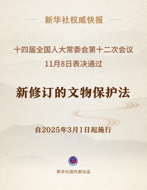 十四屆全國人大常委會(huì)第十二次會(huì)議11月8日表決通過新修訂的文物保護(hù)法,自2025年3月1日起施行。