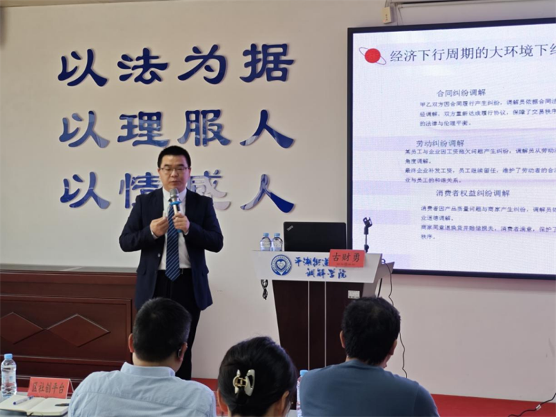 活動特邀調解實務專家古財勇主講授課,圍繞調解工作的法治化、專業(yè)化建設,重點解析兩大核心議題:一是基層調解工作中的法律適用與職業(yè)倫理規(guī)范,探討如何在糾紛處理中既堅守法律底線又兼顧情理平衡;二是物業(yè)糾紛典型案例的調解策略與技巧,通過情景模擬、角色扮演等實戰(zhàn)演練,提升調解員的臨場處置能力。古財勇還結合具體案例對培訓人員提出的調解難題和法律困惑進行逐一解答,有效解決參訓人員日常工作中的法律適用困惑,增強矛盾糾紛的化解效能。
