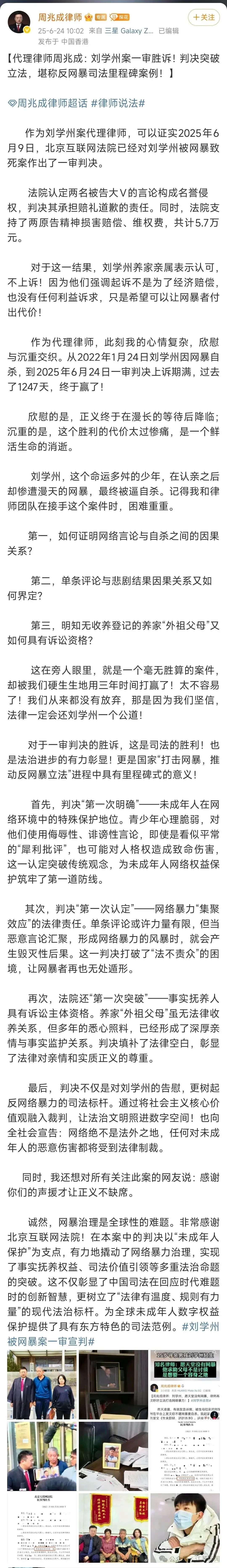 6月24日,@周兆成律師發(fā)文稱:北京互聯(lián)網(wǎng)法院已經(jīng)對劉學(xué)州被網(wǎng)暴致死案作出了一審判決。