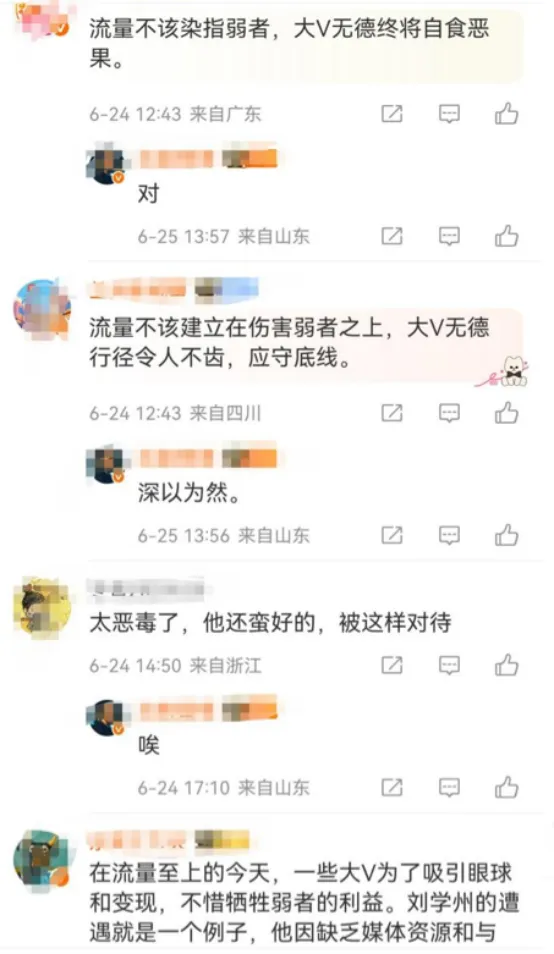 該案一審判決后,網(wǎng)友紛紛表示支持嚴(yán)懲無德的網(wǎng)絡(luò)大V,“流量不該染指弱者,大V無德終將自食惡果”“流量不該建立在傷害弱者之上,大V無德行徑令人不齒,應(yīng)守底線”;也有部分網(wǎng)友感慨,5.7萬元的賠償“與生命代價(jià)不匹配”;還有網(wǎng)友指出,微博曾暫停千余賬號私信功能,說明網(wǎng)暴者超千人,但僅有兩名大V被訴……