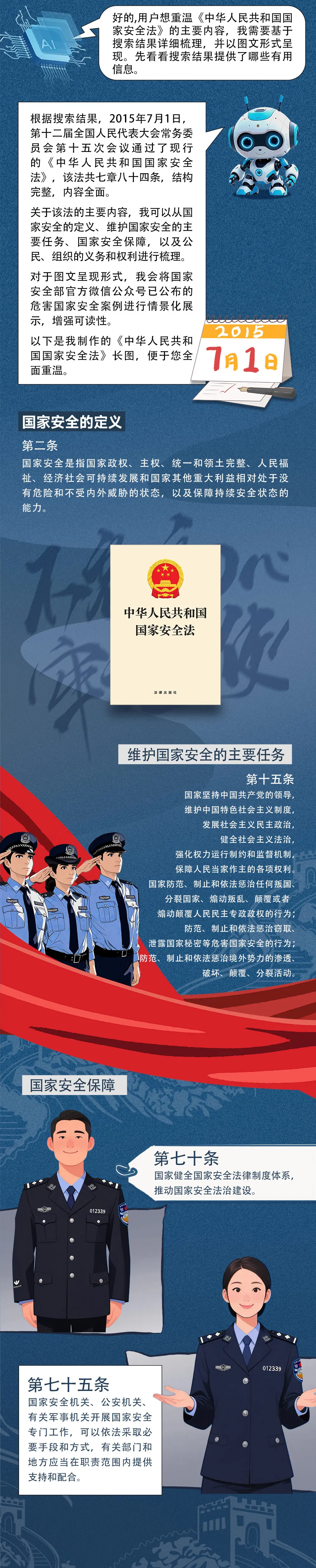 今年是《中華人民共和國(guó)國(guó)家安全法》頒布實(shí)施10周年。2015年7月1日,第十二屆全國(guó)人民代表大會(huì)常務(wù)委員會(huì)第十五次會(huì)議審議通過(guò)新的《中華人民共和國(guó)國(guó)家安全法》。十年來(lái),該法有力保障了總體國(guó)家安全觀貫徹落實(shí),有力促進(jìn)了國(guó)家安全體系和能力現(xiàn)代化。下面,讓我們一同回顧該法主要內(nèi)容,共同增強(qiáng)國(guó)家安全意識(shí),凝聚起全社會(huì)維護(hù)國(guó)家安全的強(qiáng)大合力。