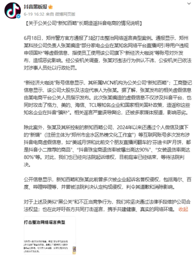 次日,抖音黑板報(bào)發(fā)布情況說明,指出警方通報(bào)中的公關(guān)公司為新知百略,其負(fù)責(zé)人張某此次編造的虛假信息涉及抖音,同時(shí)攻擊了格力、美的、海信、TCL等知名企業(yè)和國(guó)家相關(guān)國(guó)補(bǔ)政策,造謠稱這些知名企業(yè)在抖音“騙補(bǔ)”。相關(guān)謠言嚴(yán)重誤導(dǎo)輿論,還被多家媒體報(bào)道,影響惡劣。