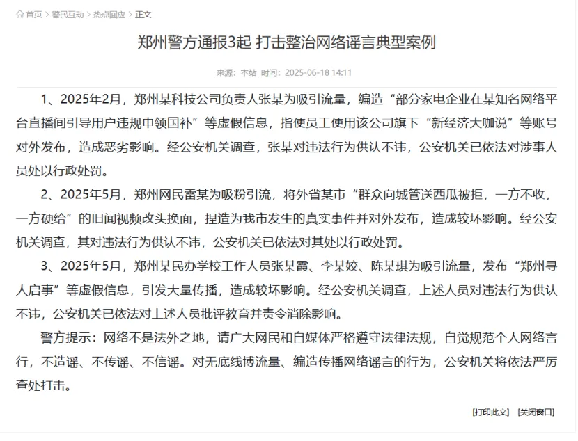 2025年2月,鄭州某科技公司負(fù)責(zé)人張某為吸引流量,編造“部分家電企業(yè)在某知名網(wǎng)絡(luò)平臺(tái)直播間引導(dǎo)用戶違規(guī)申領(lǐng)國(guó)補(bǔ)”等虛假信息,指使員工使用該公司旗下“新經(jīng)濟(jì)大咖說”等賬號(hào)對(duì)外發(fā)布,造成惡劣影響。經(jīng)公安機(jī)關(guān)調(diào)查,張某對(duì)違法行為供認(rèn)不諱,公安機(jī)關(guān)已依法對(duì)涉事人員處以行政處罰,“618”當(dāng)天,鄭州警方對(duì)此進(jìn)行了公開通報(bào)。