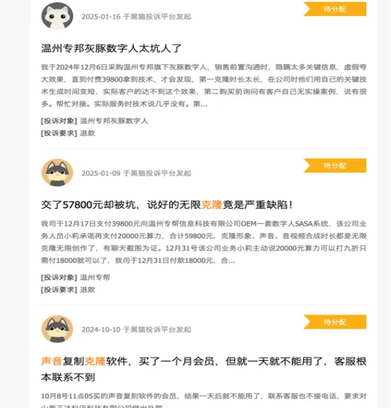 比如,有用戶投訴稱,克隆的聲音效果差,收費(fèi)不合理;有人稱買(mǎi)了一個(gè)月會(huì)員,但僅用了一天就不能用了,客服也聯(lián)系補(bǔ)上;更有用戶稱,自己交了57800元卻被坑,軟件存在嚴(yán)重缺陷。