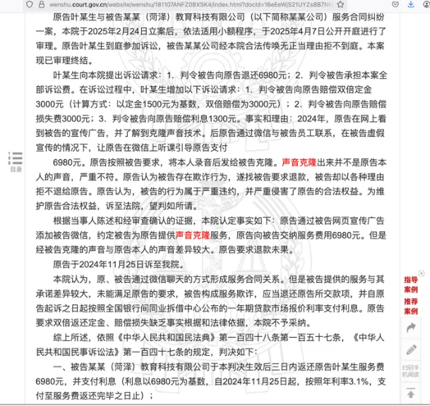 同時(shí),記者在裁判文書(shū)網(wǎng)中查詢到今年6月的一起民事案件,原告的訴求同樣是克隆聲音效果差,要求返還6980元的服務(wù)費(fèi)。