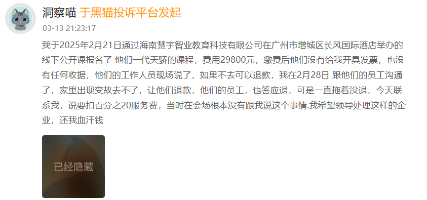 此外,在黑貓投訴上有多位消費者投訴該類開設(shè)課程機構(gòu)存在涉嫌偷稅截留、霸王扣款等問題。比如,一位女士投訴稱,在廣州報名公開課,現(xiàn)場支付費用29800元,繳費后機構(gòu)未開發(fā)票,工作人員口頭承諾“不去即退全款”。然而當(dāng)其提出因計劃有變申請退款時,機構(gòu)拖延半月后突然提出“強扣20%服務(wù)費”。